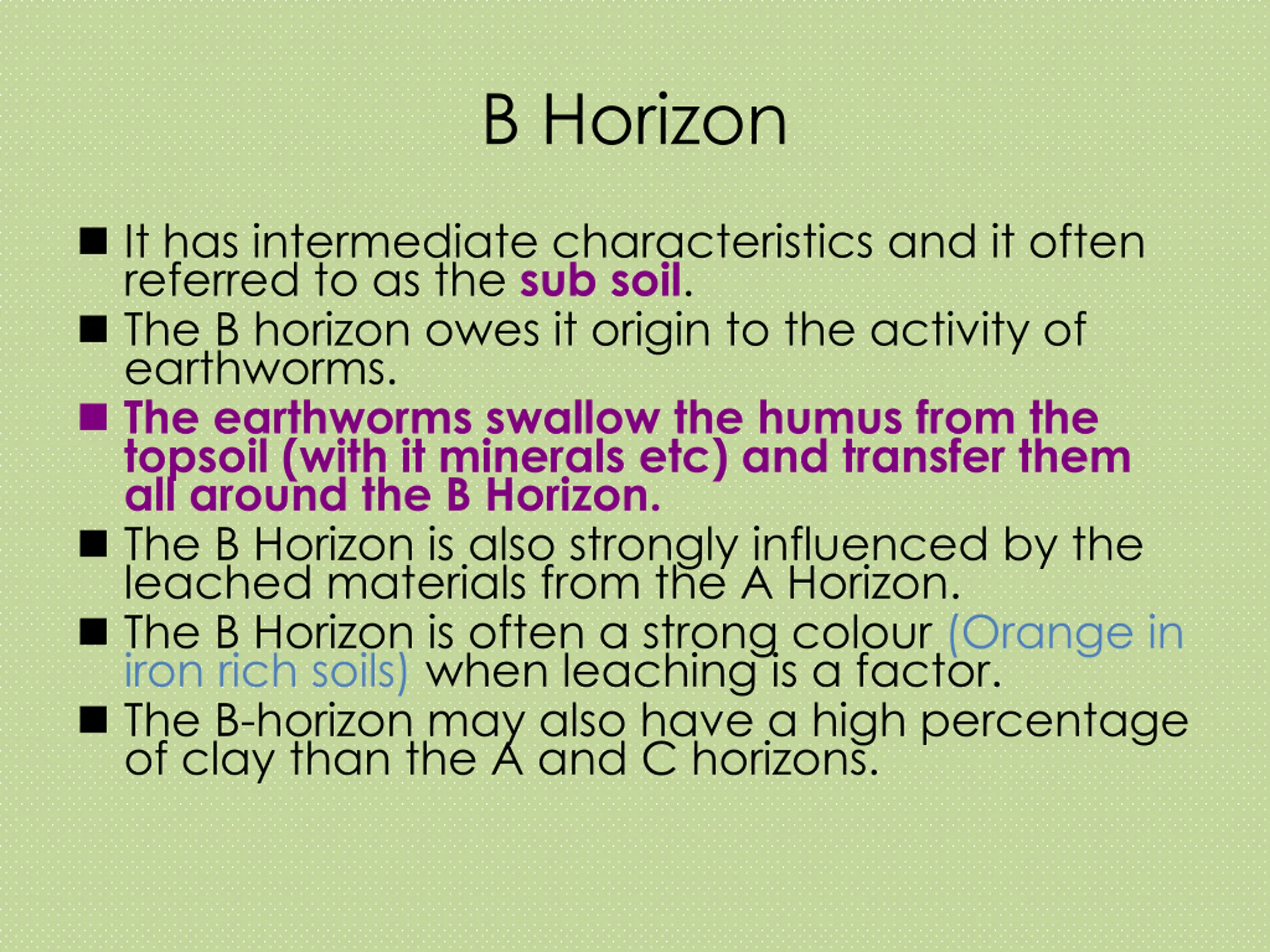 B Horizon It has intermediate characteristics and it often referred to as the sub soil. The B horizon owes it origin to the activity of earthworms. The earthworms swallow the humus from the topsoil (with it minerals etc) and transfer them all around the B Horizon. The B Horizon is also strongly influenced by the leached materials from the A Horizon. The B Horizon is often a strong colour (Orange in iron rich soils) when leaching is a factor. The B-horizon may also have a high percentage of clay than the A and C horizons.