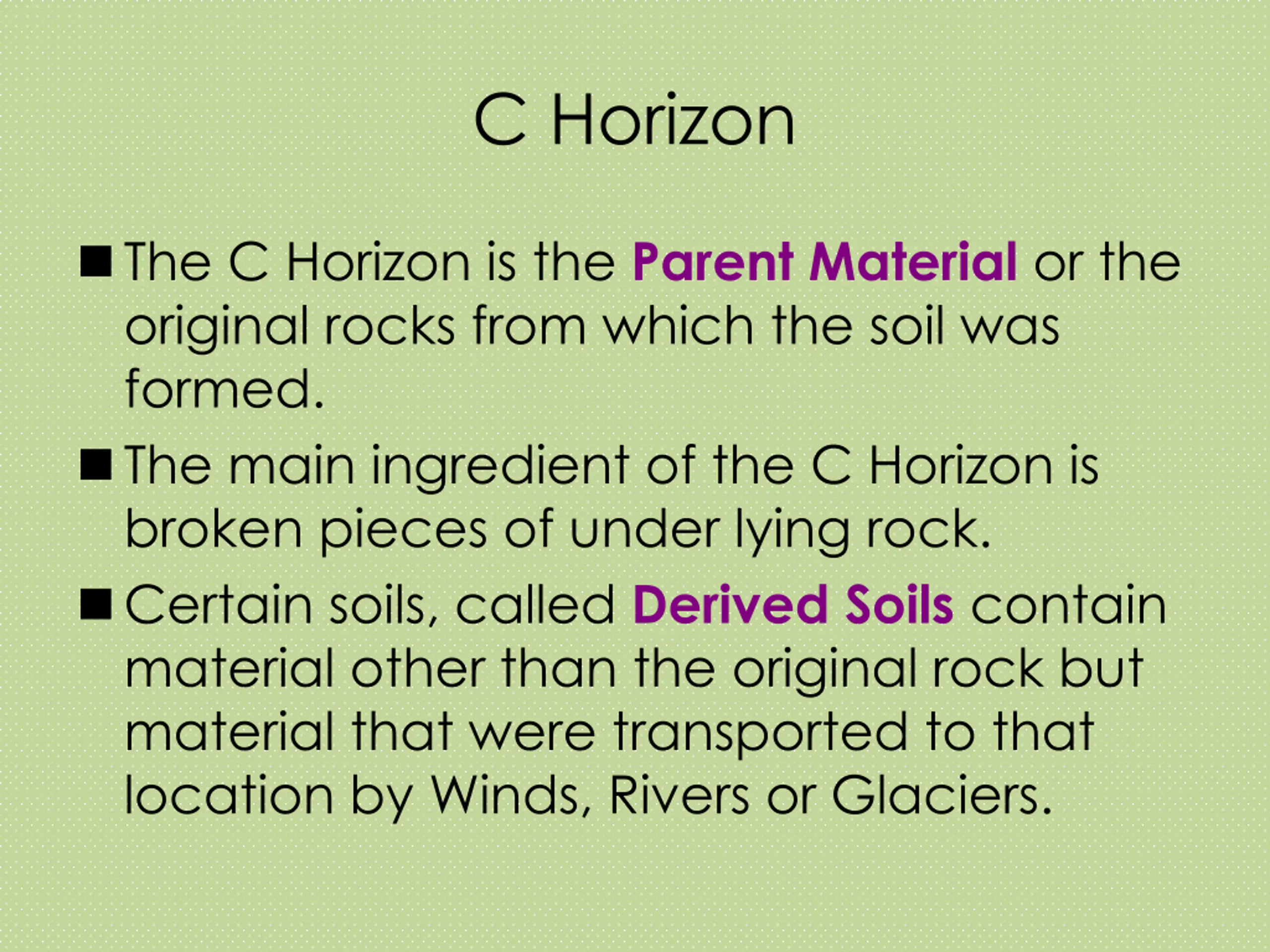 C Horizon The C Horizon is the Parent Material or the original rocks from which the soil was formed. The main ingredient of the C Horizon is broken pieces of under lying rock. Certain soils, called Derived Soils contain material other than the original rock but material that were transported to that location by Winds, Rivers or Glaciers.