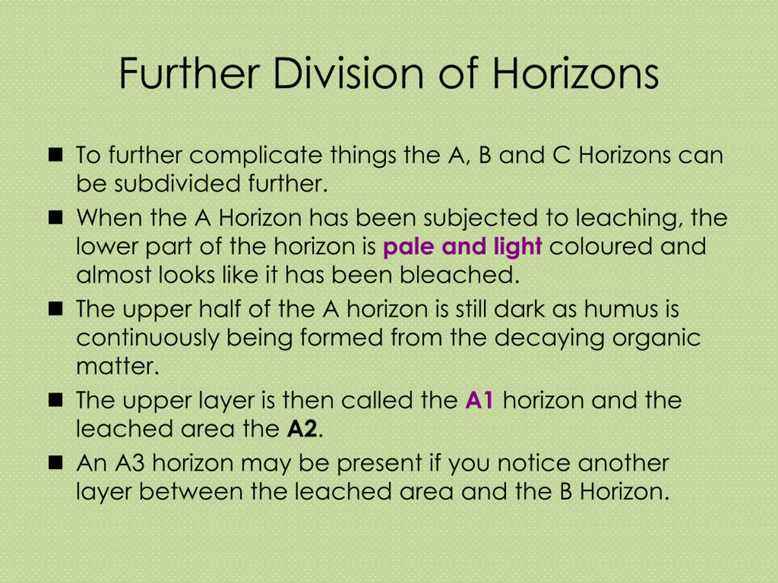Further Division of Horizons To further complicate things the A, B and C Horizons can be subdivided further. When the A Horizon has been subjected to leaching, the lower part of the horizon is pale and light coloured and almost looks like it has been bleached. The upper half of the A horizon is still dark as humus is continuously being formed from the decaying organic matter. The upper layer is then called the A1 horizon and the leached area the A2. An A3 horizon may be present if you notice another layer between the leached area and the B Horizon.