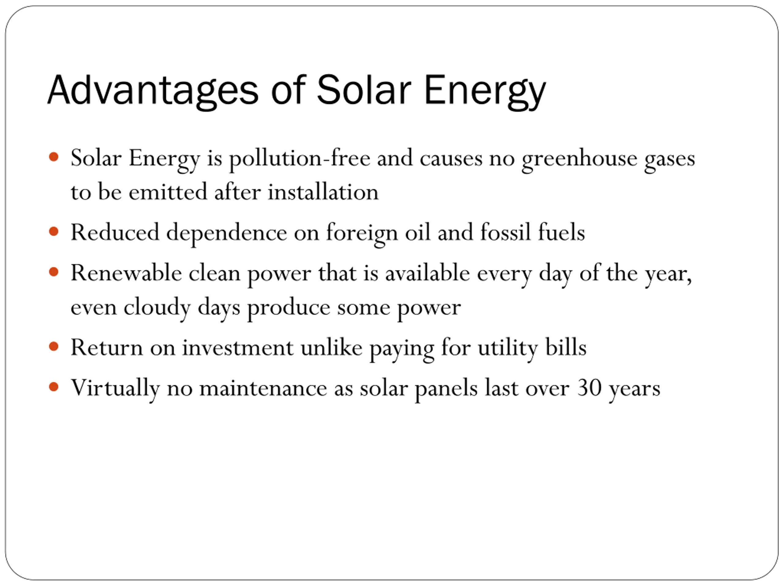 Advantages of Solar Energy Solar Energy is pollution-free and causes no greenhouse gases to be emitted after installation Reduced dependence on foreign oil and fossil fuels Renewable clean power that is available every day of the year, even cloudy days produce some power Return on investment unlike paying for utility bills Virtually no maintenance as solar panels last over 30 years