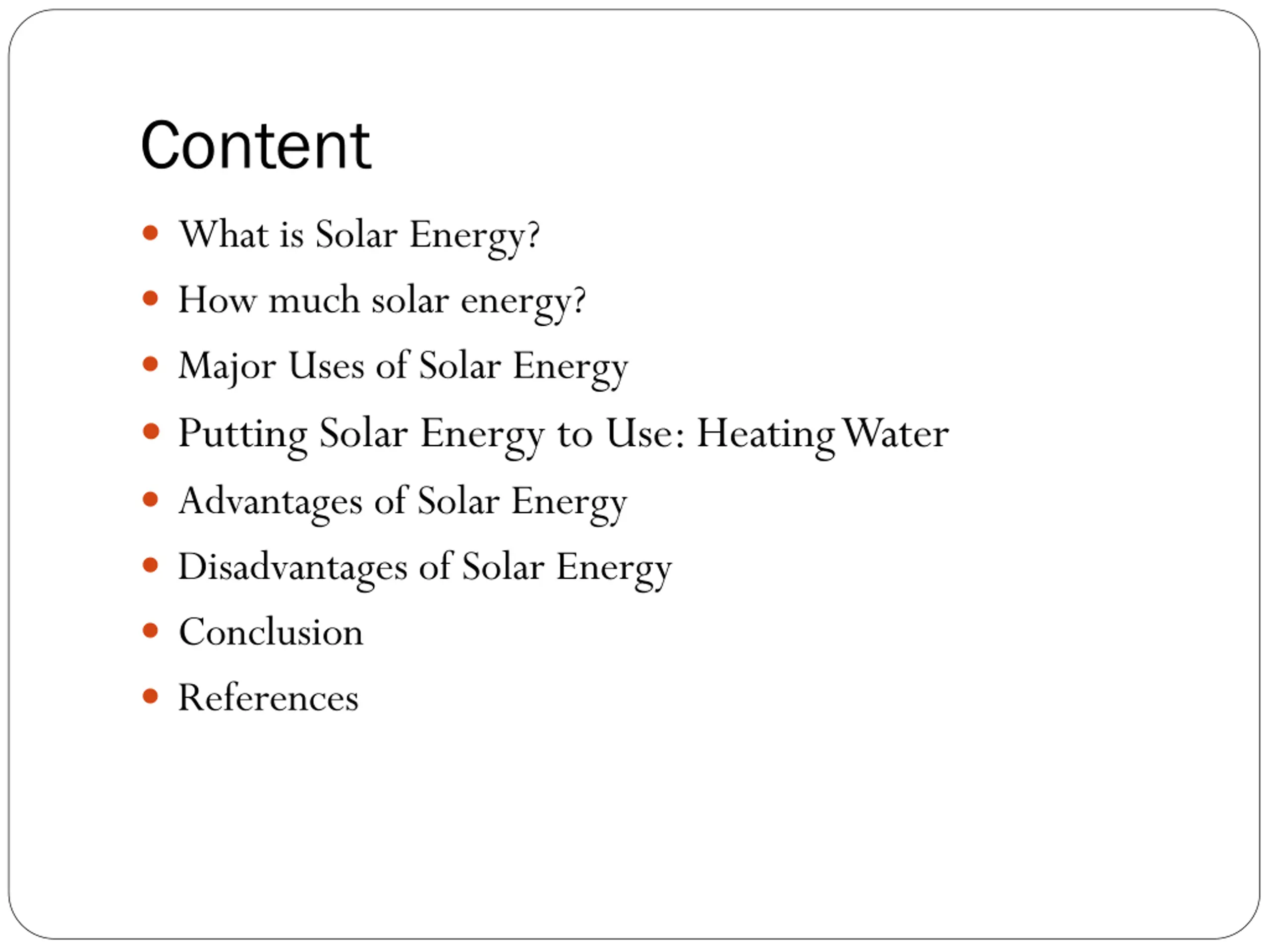 Content What is Solar Energy? How much solar energy? Major Uses of Solar Energy Putting Solar Energy to Use: Heating Water Advantages of Solar Energy Disadvantages of Solar Energy Conclusion References