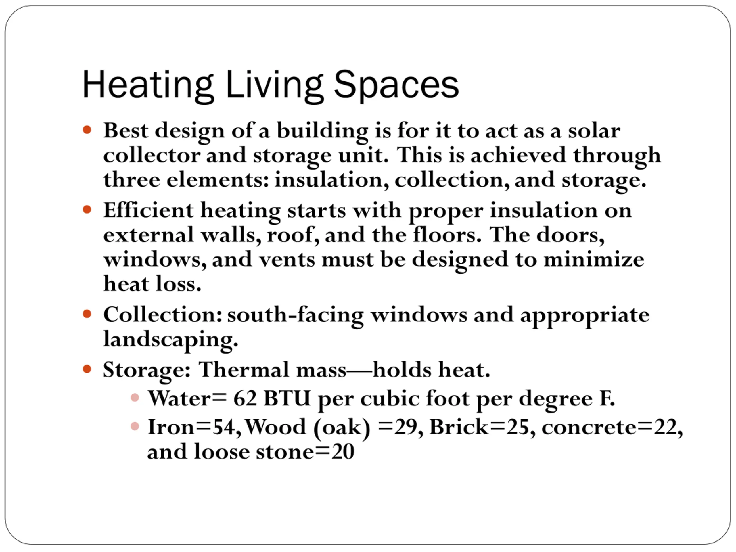 Heating Living Spaces Best design of a building is for it to act as a solar collector and storage unit. This is achieved through three elements: insulation, collection, and storage. Efficient heating starts with proper insulation on external walls, roof, and the floors. The doors, windows, and vents must be designed to minimize heat loss. Collection: south-facing windows and appropriate landscaping. Storage: Thermal mass holds heat. Water= 62 BTU per cubic foot per degree F. Iron=54, Wood (oak) =29, Brick=25, concrete=22, and loose stone=20