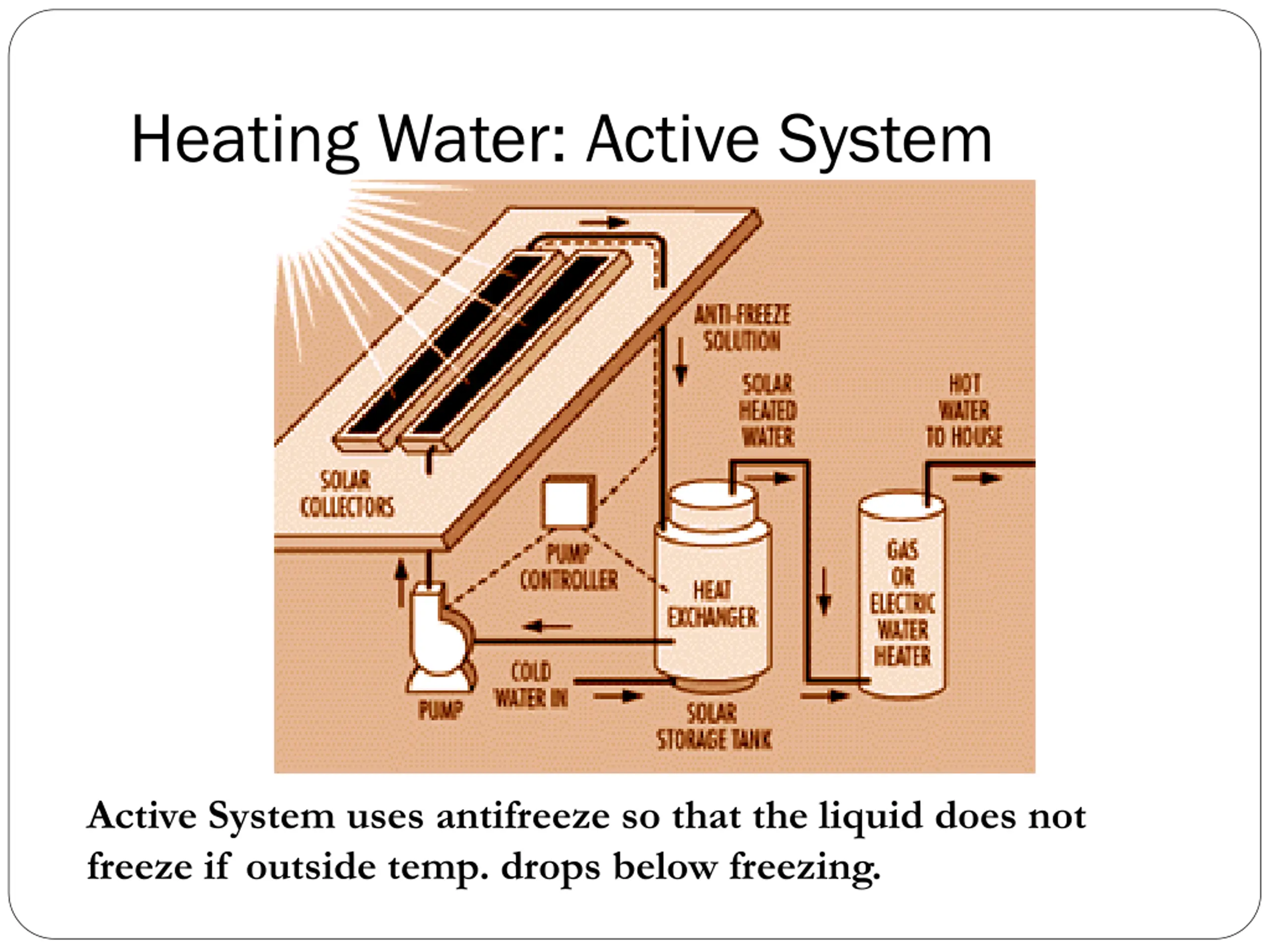 Heating Water: Active System Active System uses antifreeze so that the liquid does not freeze if outside temp. drops below freezing.