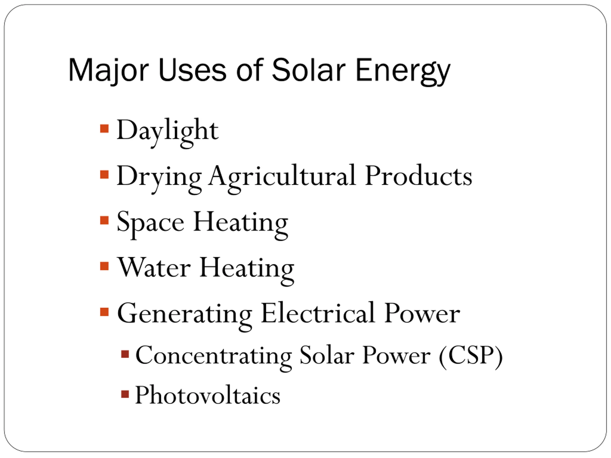 Major Uses of Solar Energy Daylight Drying Agricultural Products Space Heating Water Heating Generating Electrical Power Concentrating Solar Power (CSP) Photovoltaics