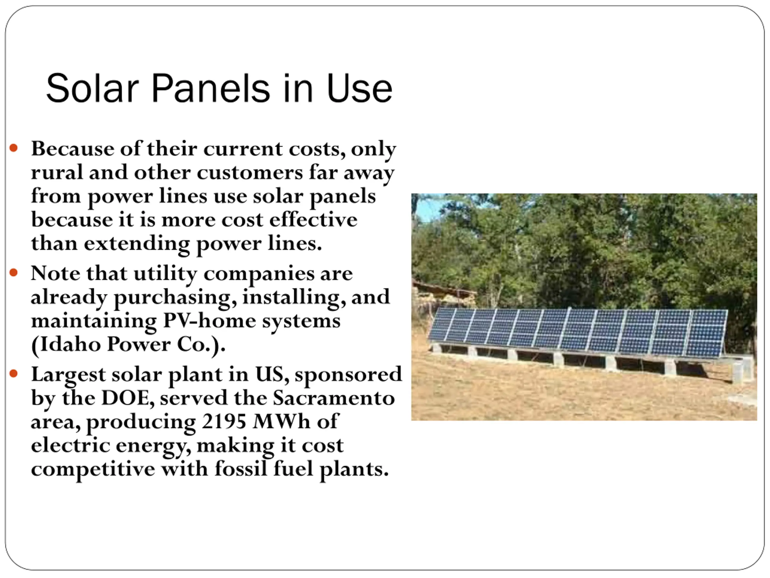 Solar Panels in Use Because of their current costs, only rural and other customers far away from power lines use solar panels because it is more cost effective than extending power lines. Note that utility companies are already purchasing, installing, and maintaining PV-home systems (Idaho Power Co.). Largest solar plant in US, sponsored by the DOE, served the Sacramento area, producing 2195 MWh of electric energy, making it cost competitive with fossil fuel plants.