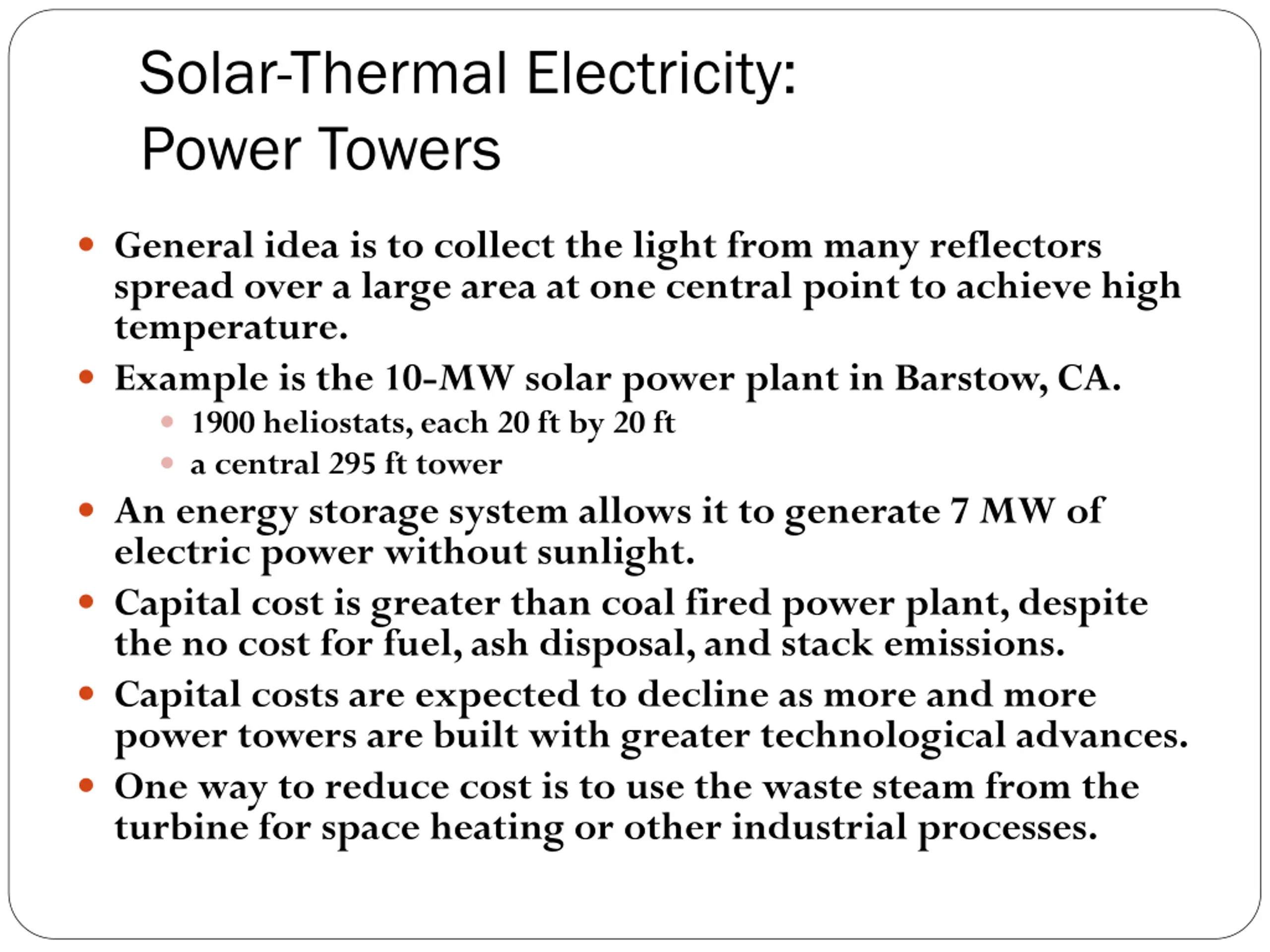 Solar-Thermal Electricity: Power Towers General idea is to collect the light from many reflectors spread over a large area at one central point to achieve high temperature. Example is the 10-MW solar power plant in Barstow, CA. 1900 heliostats, each 20 ft by 20 ft a central 295 ft tower An energy storage system allows it to generate 7 MW of electric power without sunlight. Capital cost is greater than coal fired power plant, despite the no cost for fuel, ash disposal, and stack emissions. Capital costs are expected to decline as more and more power towers are built with greater technological advances. One way to reduce cost is to use the waste steam from the turbine for space heating or other industrial processes.