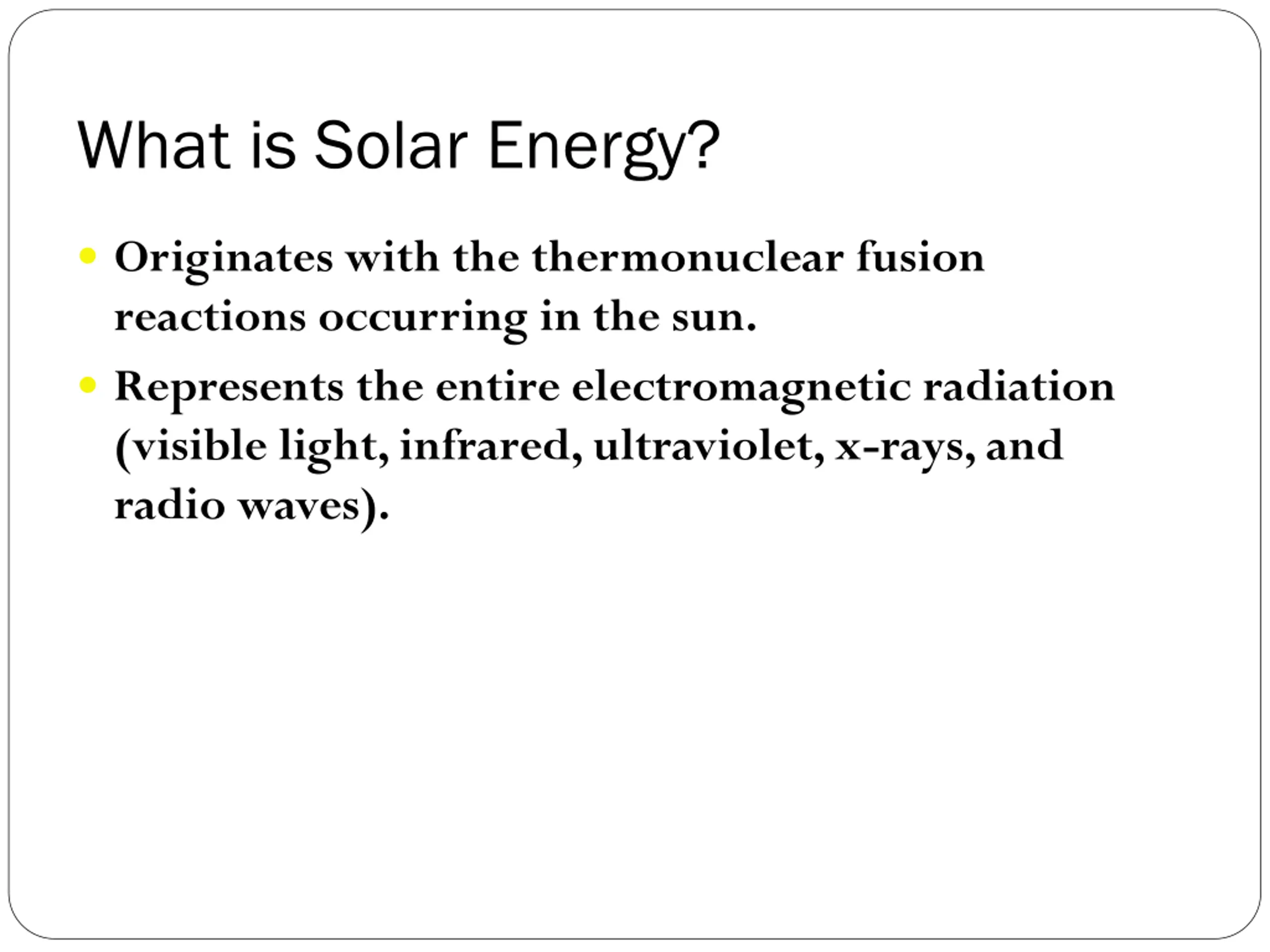 What is Solar Energy? Originates with the thermonuclear fusion reactions occurring in the sun. Represents the entire electromagnetic radiation (visible light, infrared, ultraviolet, x-rays, and radio waves).