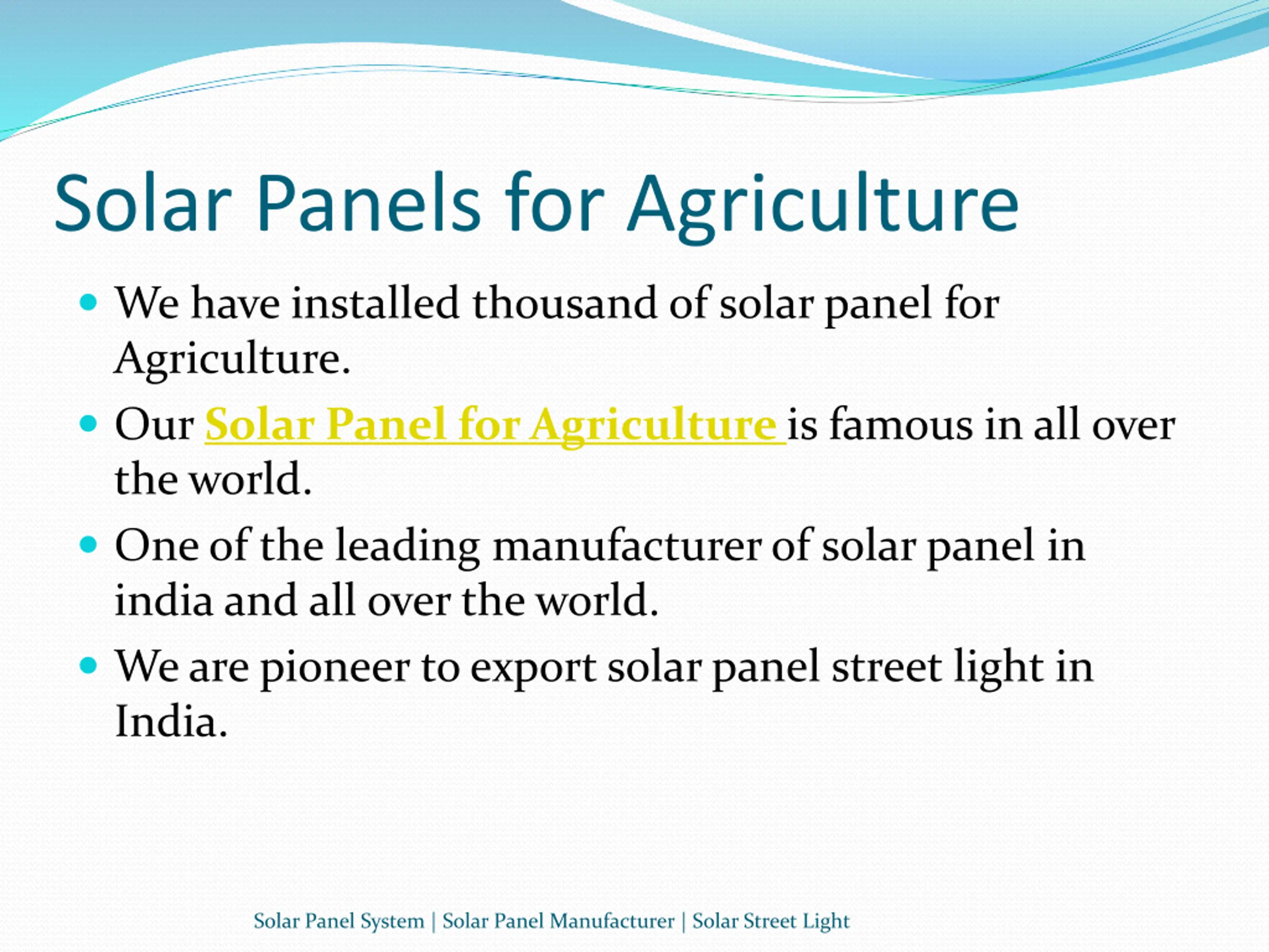 Solar Panels for Agriculture We have installed thousand of solar panel for Agriculture. Our Solar Panel for Agriculture is famous in all over the world. One of the leading manufacturer of solar panel in india and all over the world. We are pioneer to export solar panel street light in India. Solar Panel System | Solar Panel Manufacturer | Solar Street Light