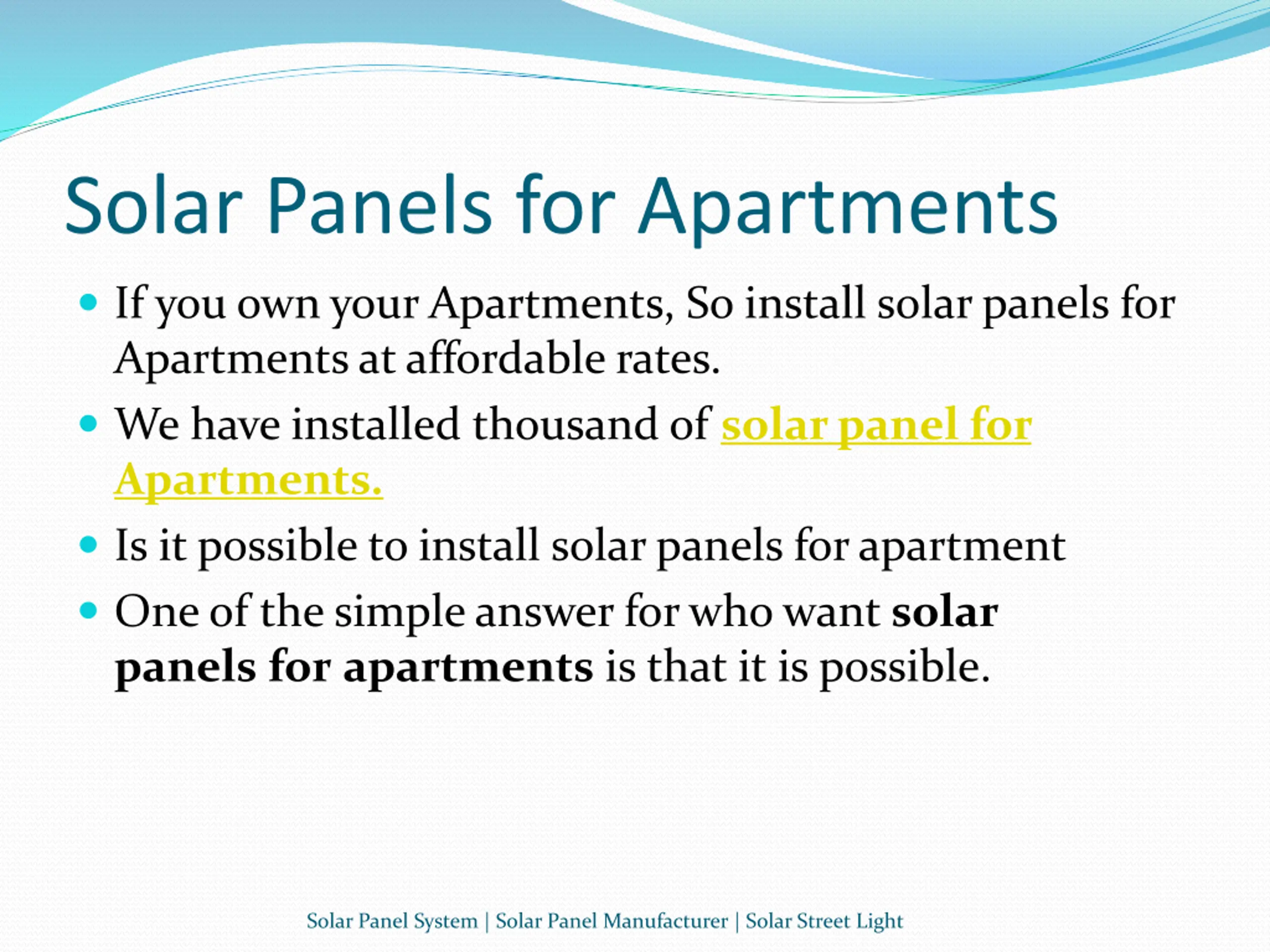 Solar Panels for Apartments If you own your Apartments, So install solar panels for Apartments at affordable rates. We have installed thousand of solar panel for Apartments. Is it possible to install solar panels for apartment One of the simple answer forwho want solar panels for apartments is that it is possible. Solar Panel System | Solar Panel Manufacturer | Solar Street Light