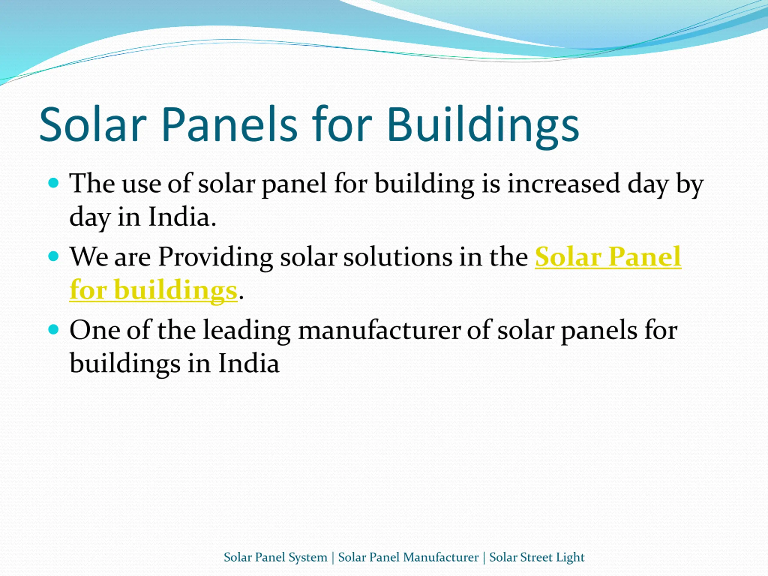 Solar Panels for Buildings The use of solar panel for building is increased day by day in India. We are Providing solar solutions in the Solar Panel for buildings. One of the leading manufacturer of solar panels for buildings in India Solar Panel System | Solar Panel Manufacturer | Solar Street Light