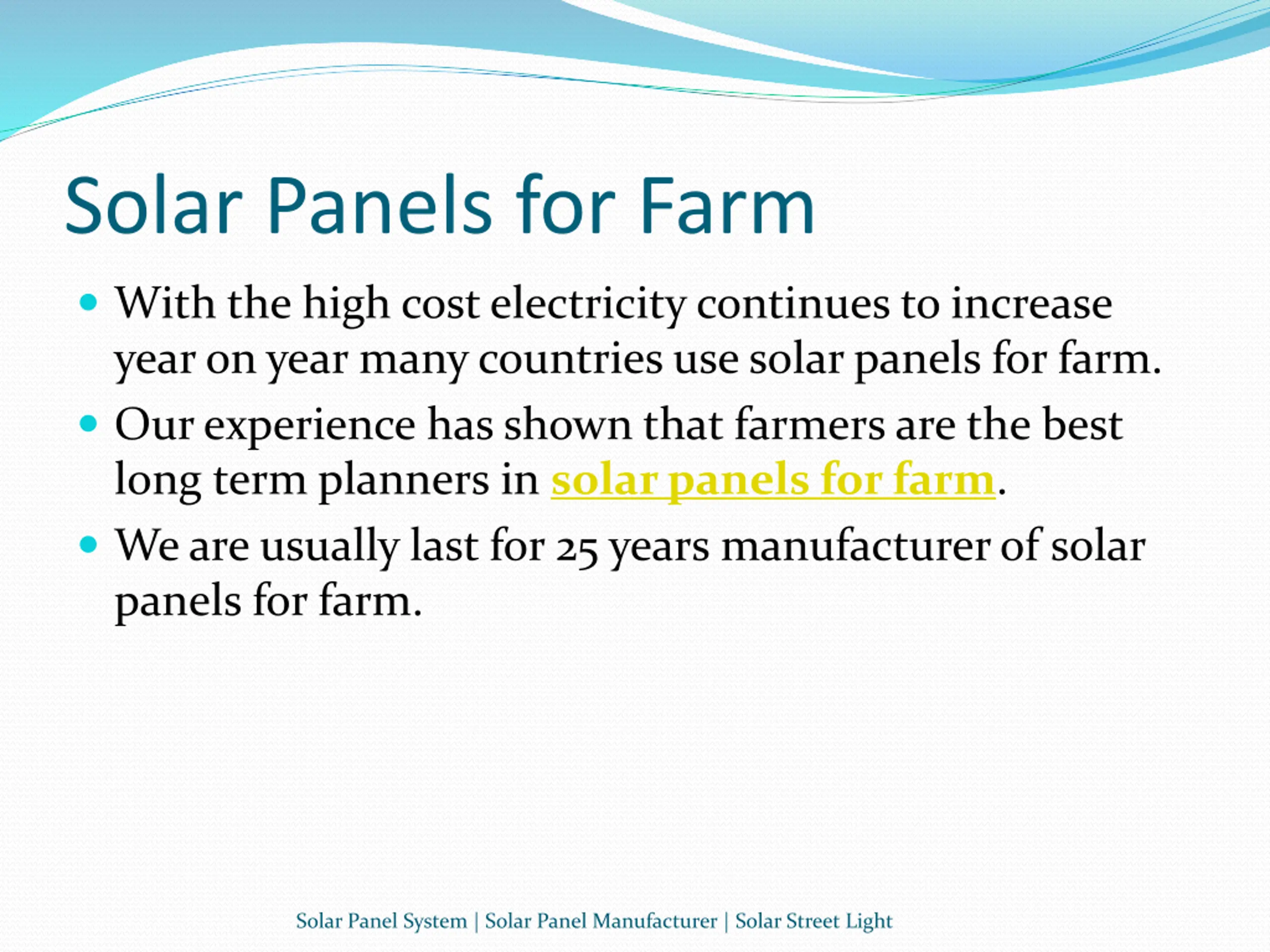 Solar Panels for Farm With the high cost electricity continues to increase year on year many countries use solar panels for farm. Our experience has shown that farmers are the best long term planners in solar panels for farm. We are usually last for 25 years manufacturer of solar panels for farm. Solar Panel System | Solar Panel Manufacturer | Solar Street Light