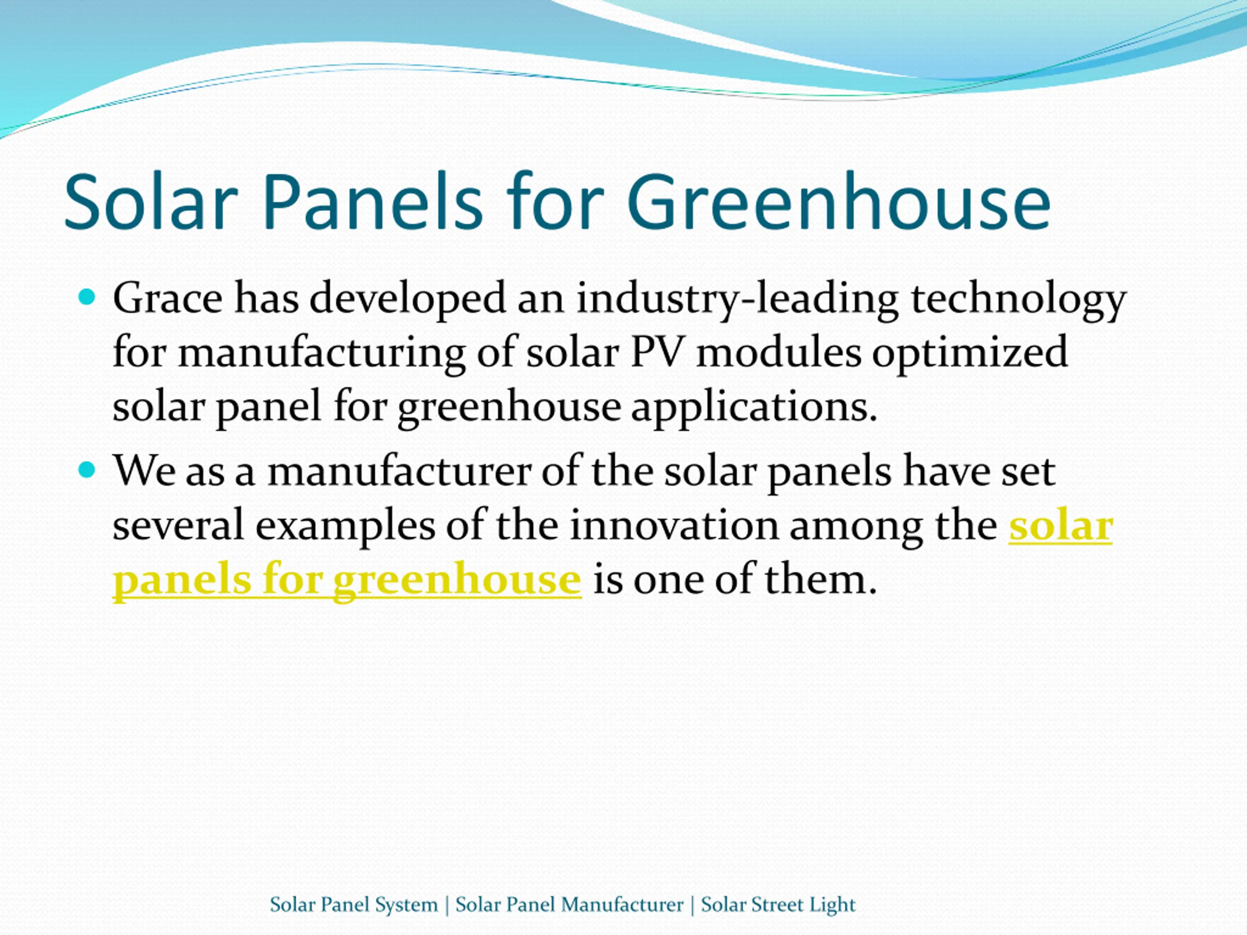 Solar Panels for Greenhouse Grace has developed an industry-leading technology for manufacturing of solar PV modules optimized solar panel for greenhouse applications. We as a manufacturer of the solar panels have set several examples of the innovation among the solar panels for greenhouse is one of them. Solar Panel System | Solar Panel Manufacturer | Solar Street Light
