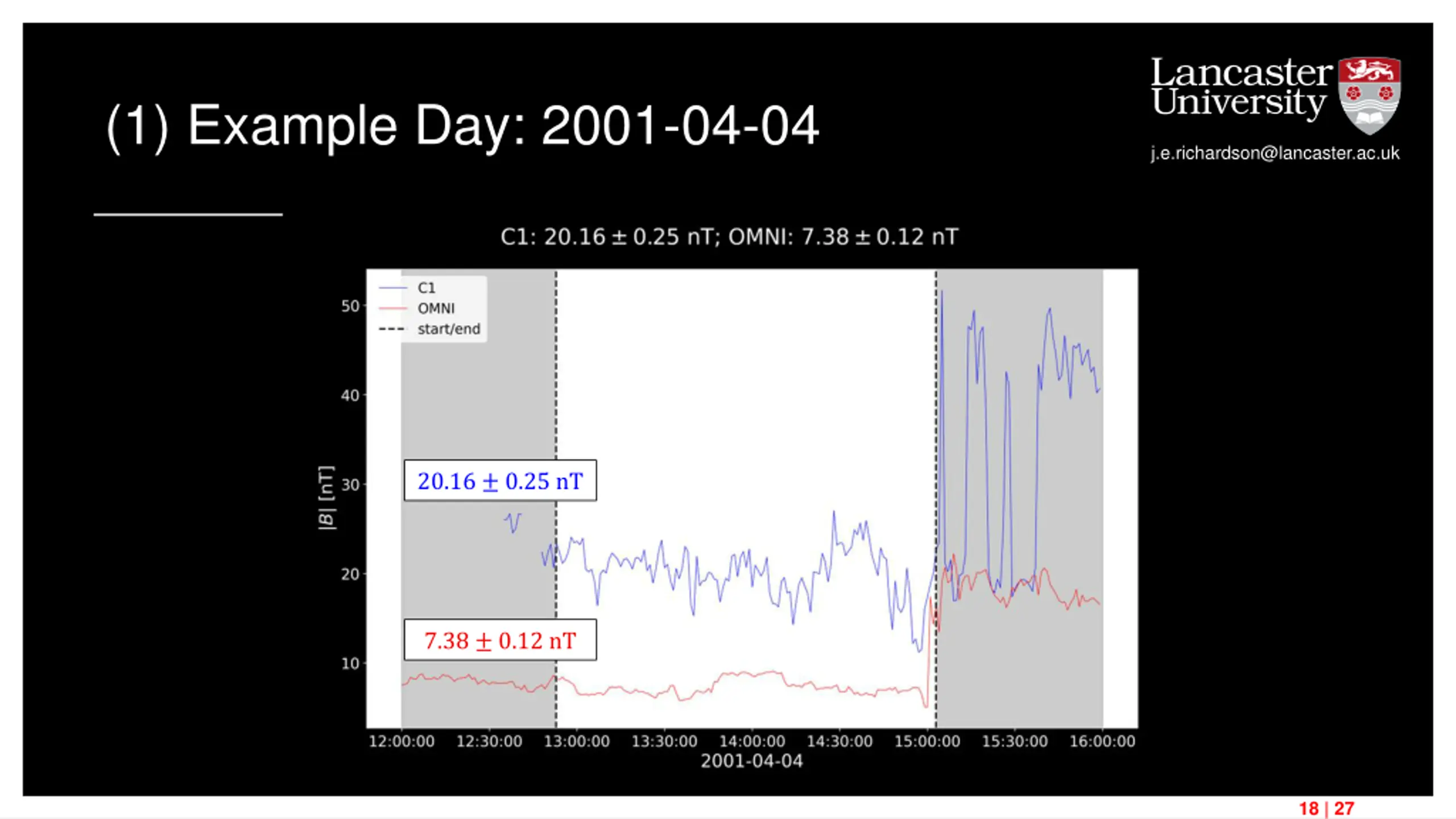 (1) Example Day: 2001-04-04 j.e.richardson@lancaster.ac.uk 20.16 0.25 nT 7.38 0.12 nT 18 | 27