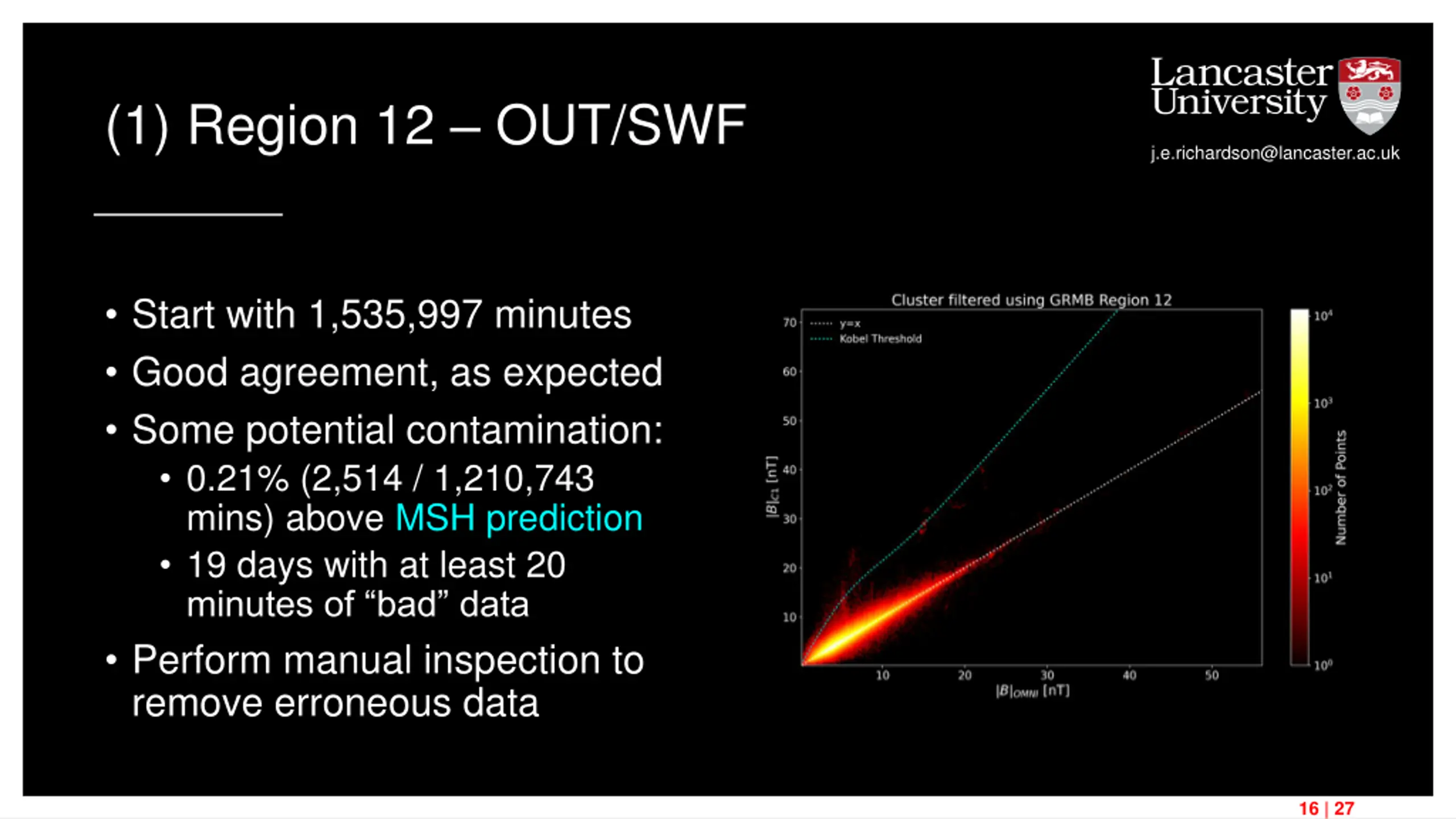 (1) Region 12 OUT/SWF j.e.richardson@lancaster.ac.uk Start with 1,535,997 minutes Good agreement, as expected Some potential contamination: 0.21% (2,514 / 1,210,743 mins) above MSH prediction 19 days with at least 20 minutes of bad data Perform manual inspection to remove erroneous data 16 | 27