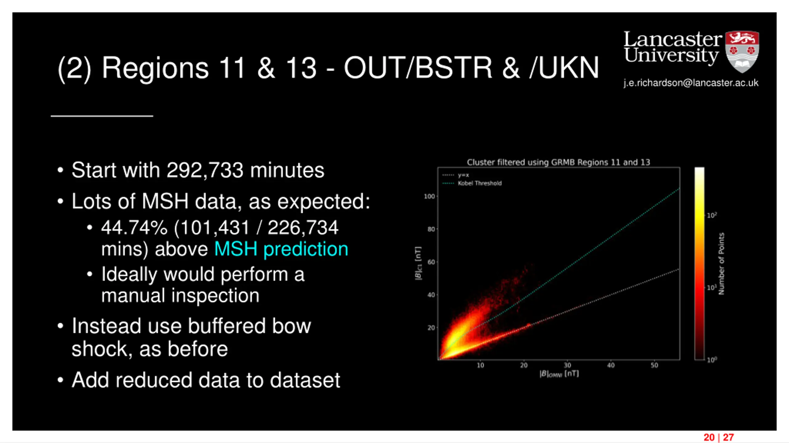 (2) Regions 11 & 13 - OUT/BSTR & /UKN j.e.richardson@lancaster.ac.uk Start with 292,733 minutes Lots of MSH data, as expected: 44.74% (101,431 / 226,734 mins) above MSH prediction Ideally would perform a manual inspection Instead use buffered bow shock, as before Add reduced data to dataset 20 | 27