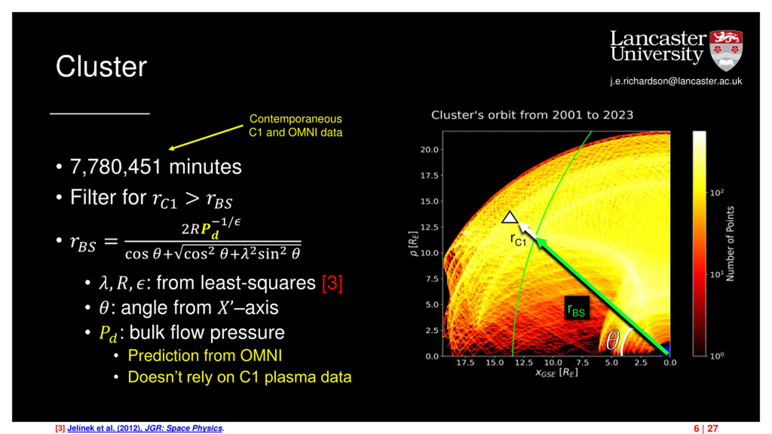 Cluster j.e.richardson@lancaster.ac.uk 10,113,475 minutes Filter for ??1> ??? 1/? 2??? rC1 ???= cos ?+ cos2?+?2sin2? ?,?,?: from least-squares [3] ?: angle from ? axis ??: bulk flow pressure ??? calculated at each minute rBS ? 5 | 27 [3] Jel nek et al. (2012), JGR: Space Physics.