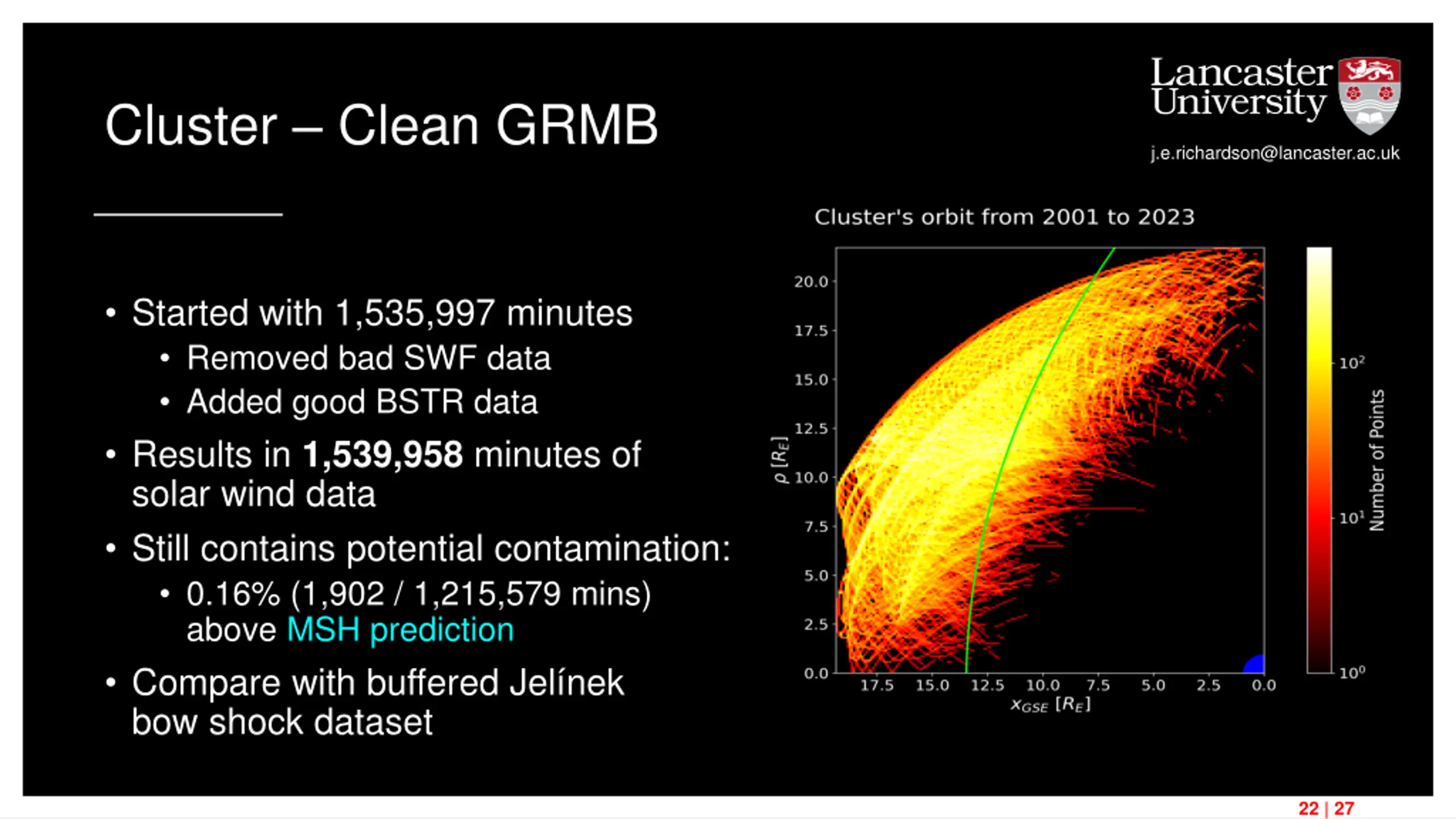 Cluster Clean GRMB j.e.richardson@lancaster.ac.uk Started with 1,535,997 minutes Removed bad SWF data Added good BSTR data Results in 1,539,958 minutes of solar wind data Still contains potential contamination: 0.16% (1,902 / 1,215,579 mins) above MSH prediction Compare with buffered Jel nek bow shock dataset 22 | 27
