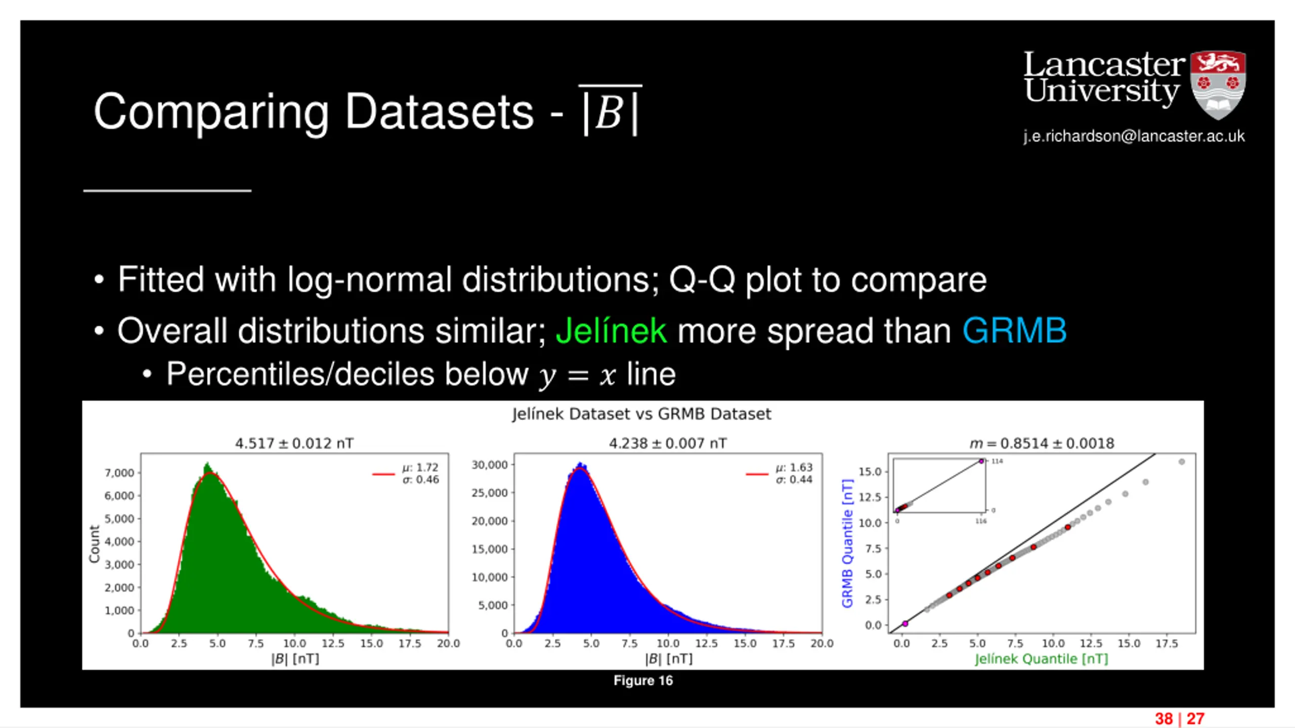 Comparing Datasets - ? j.e.richardson@lancaster.ac.uk Fitted with log-normal distributions; Q-Q plot to compare Overall distributions similar; Jel nek more spread than GRMB Percentiles/deciles below ? = ? line Figure 16 38 | 27