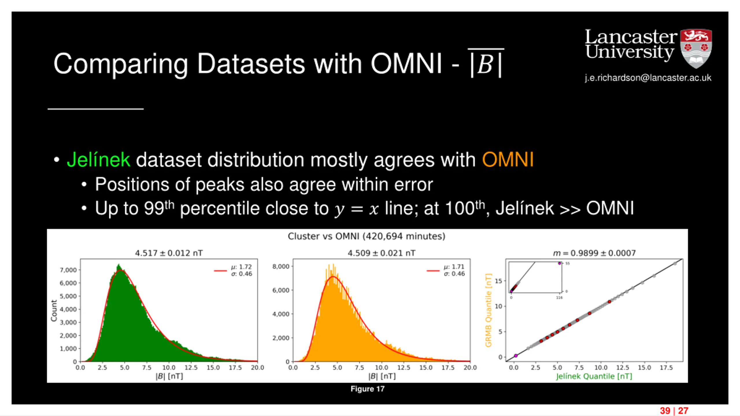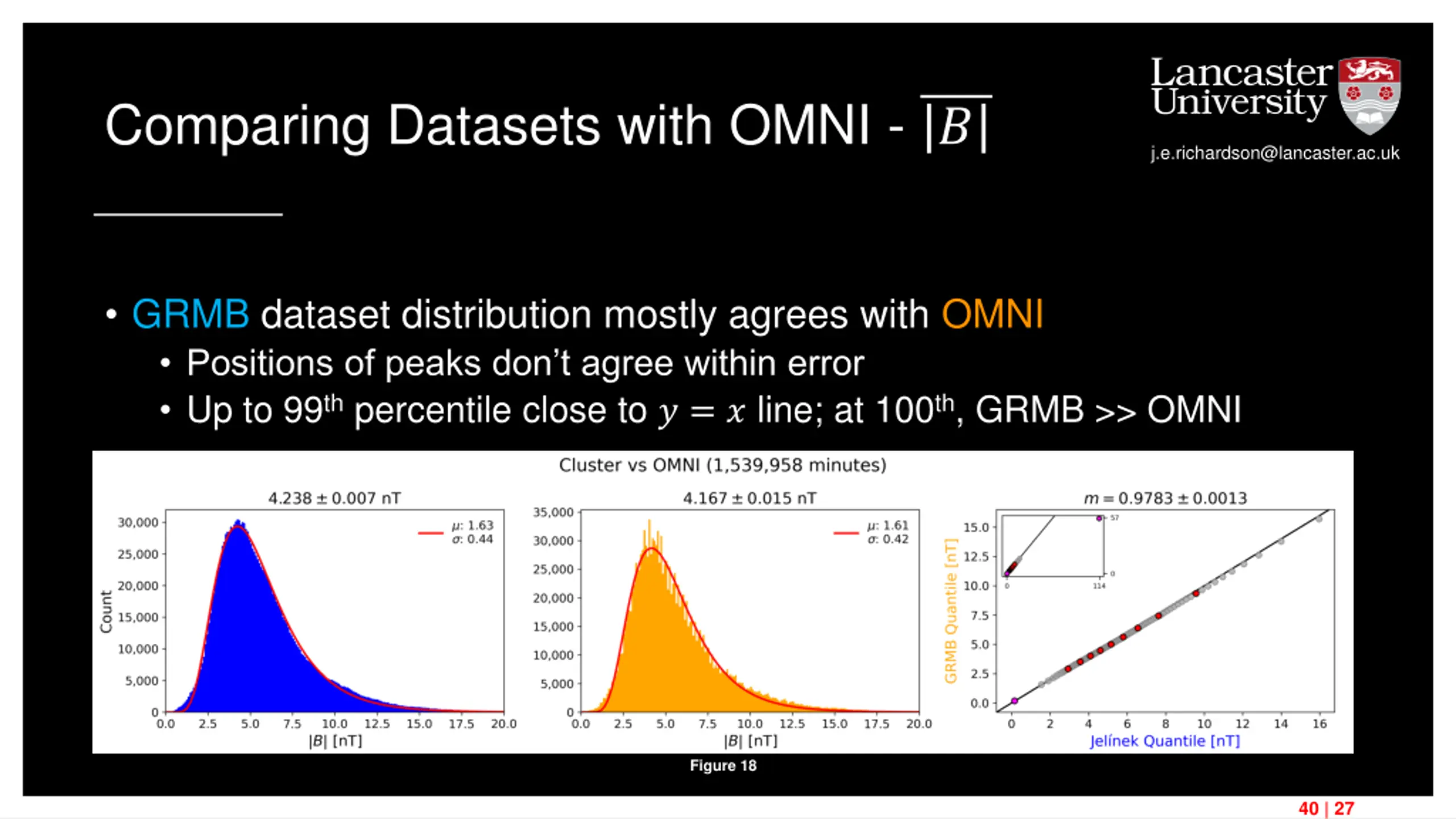 Comparing Datasets with OMNI - ? j.e.richardson@lancaster.ac.uk GRMB dataset distribution mostly agrees with OMNI Positions of peaks don t agree within error Up to 99th percentile close to ? = ? line; at 100th, GRMB >> OMNI Figure 18 40 | 27