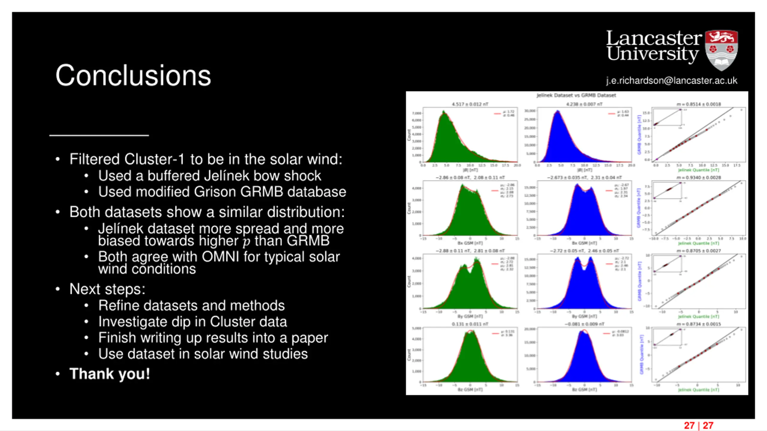 Conclusions j.e.richardson@lancaster.ac.uk Filtered Cluster-1 to be in the solar wind: Used a buffered Jel nek bow shock Used modified Grison GRMB database Both datasets show a similar distribution: Jel nek dataset more spread and more biased towards higher ? than GRMB Both agree with OMNI for typical solar wind conditions Next steps: Refine datasets and methods Investigate dip in Cluster data Finish writing up results into a paper Use dataset in solar wind studies Thank you! 27 | 27