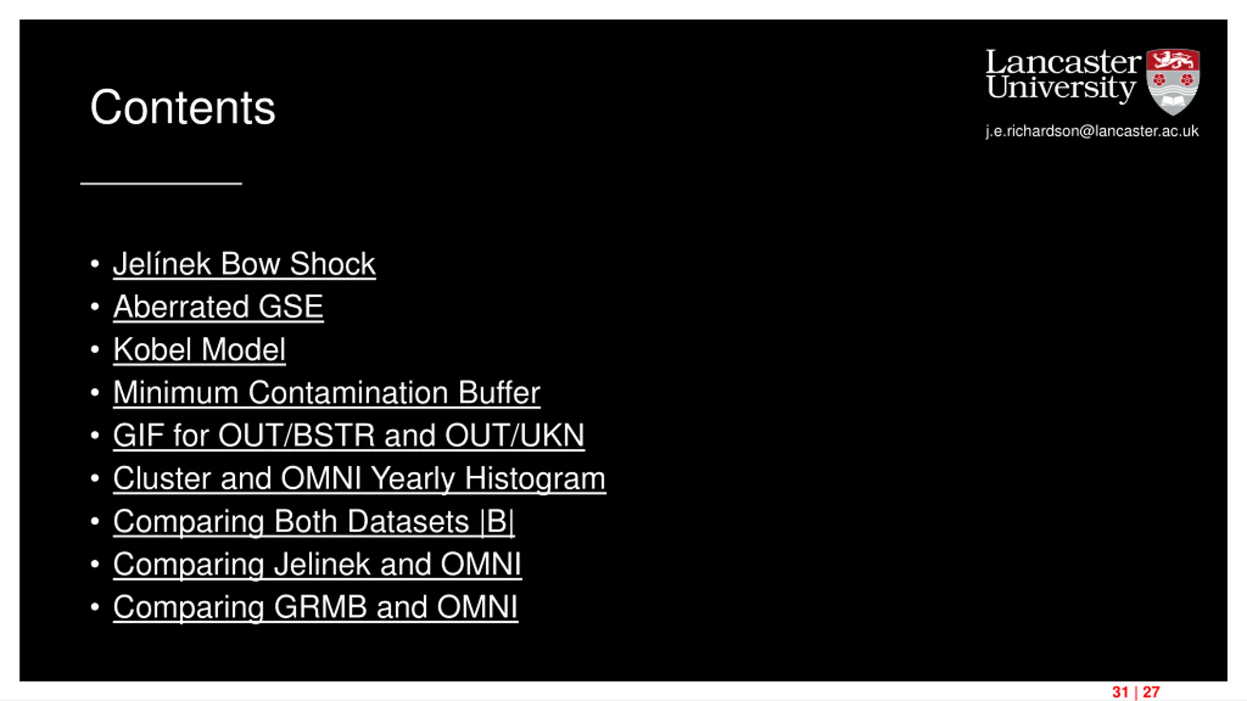 Contents j.e.richardson@lancaster.ac.uk Jel nek Bow Shock Aberrated GSE Kobel Model Minimum Contamination Buffer GIF for OUT/BSTR and OUT/UKN Cluster and OMNI Yearly Histogram Comparing Both Datasets |B| Comparing Jelinek and OMNI Comparing GRMB and OMNI 31 | 27