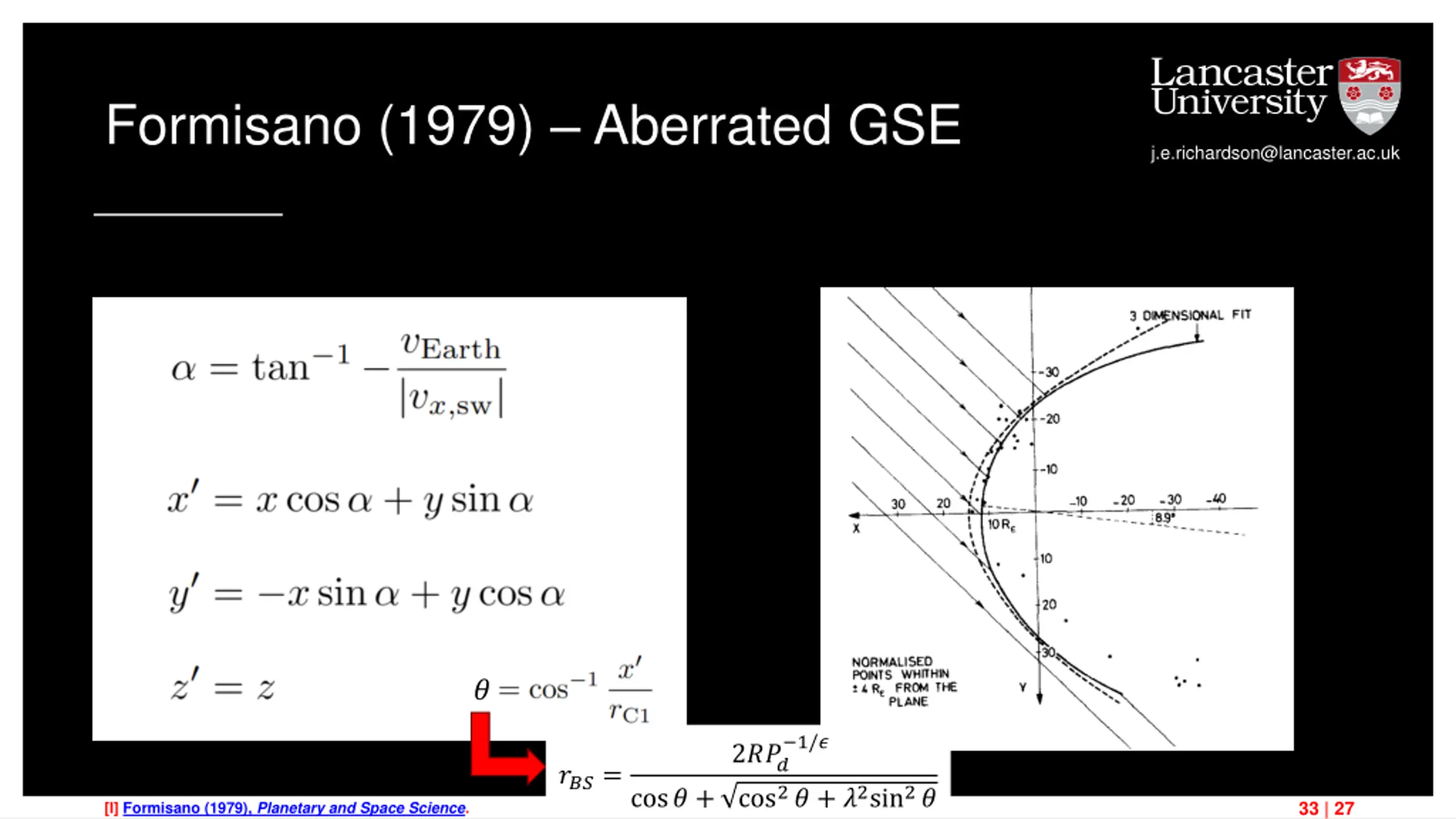 Formisano (1979) Aberrated GSE j.e.richardson@lancaster.ac.uk ? 1/? 2??? ???= cos? + cos2? + ?2sin2? 33 | 27 [I] Formisano (1979), Planetary and Space Science.