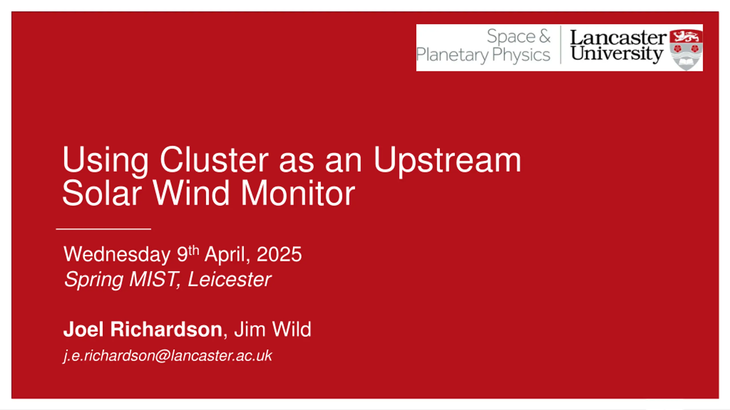 j.e.richardson@lancaster.ac.uk Using Cluster as an Upstream Solar Wind Monitor Wednesday 9thApril, 2025 Spring MIST, Leicester Joel Richardson, Jim Wild j.e.richardson@lancaster.ac.uk 1 | 27
