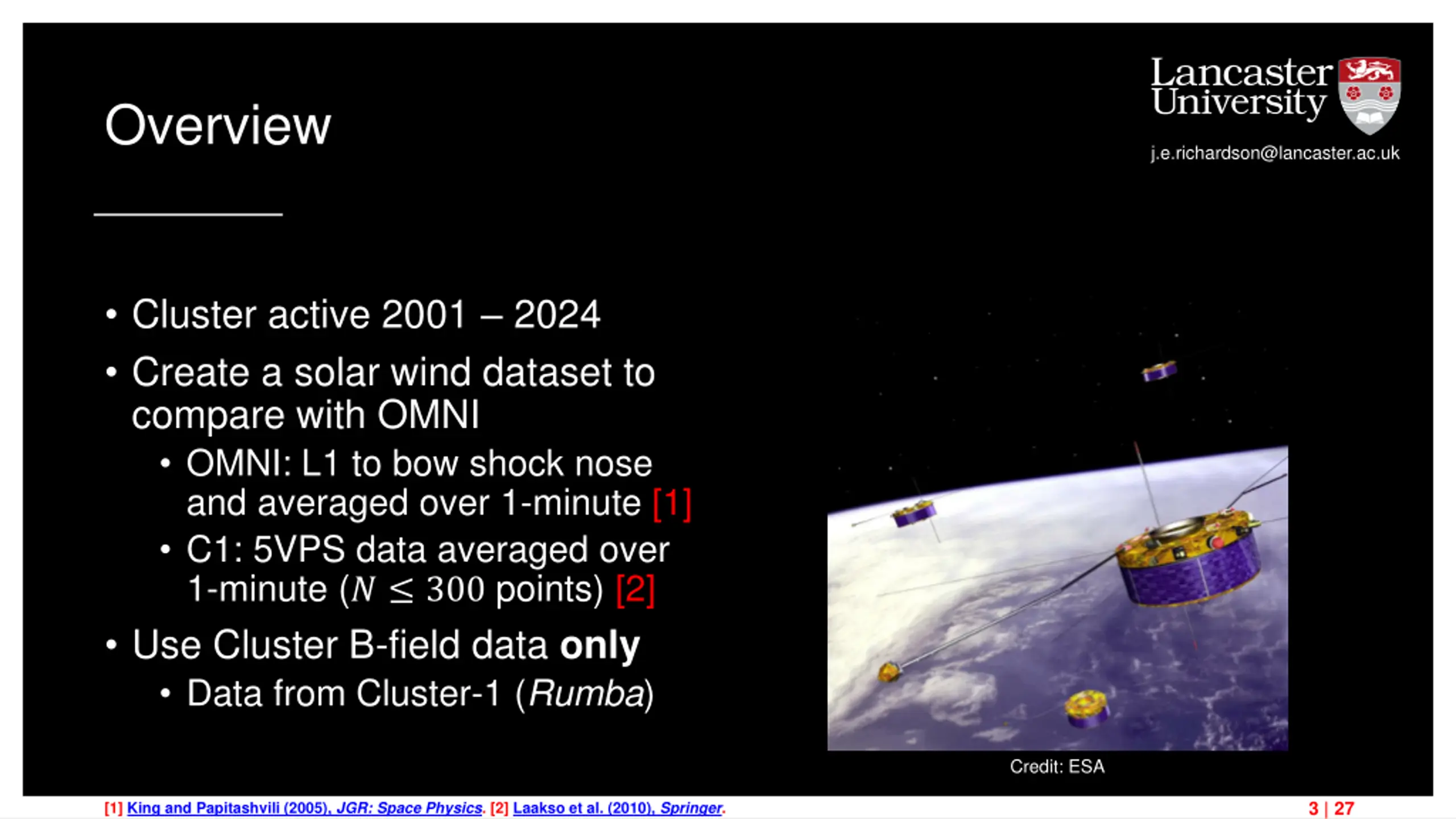 Overview j.e.richardson@lancaster.ac.uk Cluster active 2001 2024 Create a solar wind dataset to compare with OMNI OMNI: L1 to bow shock nose and averaged over 1-minute [1] C1: 5VPS data averaged over 1-minute (? 300 points) [2] Use Cluster B-field data only Data from Cluster-1 (Rumba) Credit: ESA 3 | 27 [1] King and Papitashvili (2005), JGR: Space Physics. [2] Laakso et al. (2010), Springer.