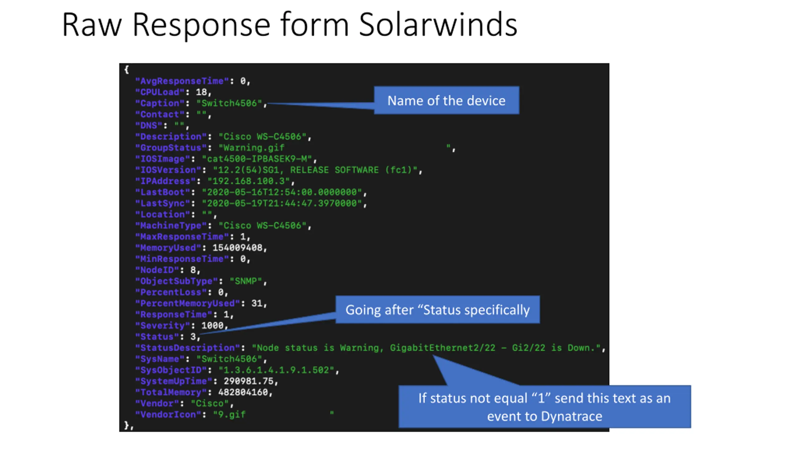 Raw Response form Solarwinds Name of the device Going after Status specifically If status not equal 1 send this text as an event to Dynatrace