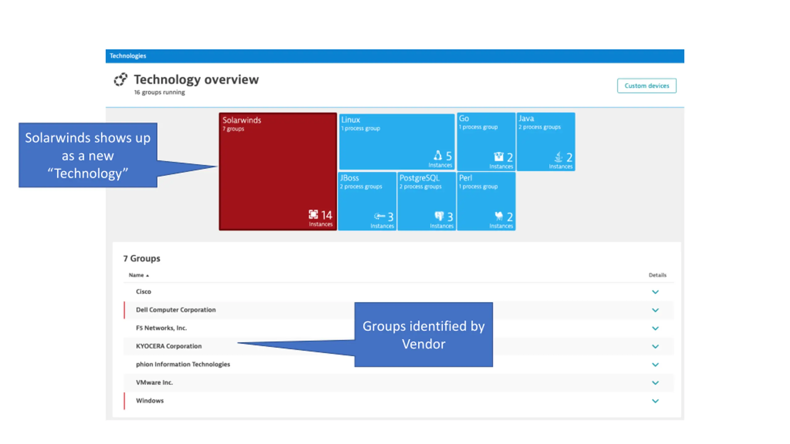 Solarwinds shows up as a new Technology Groups identified by Vendor