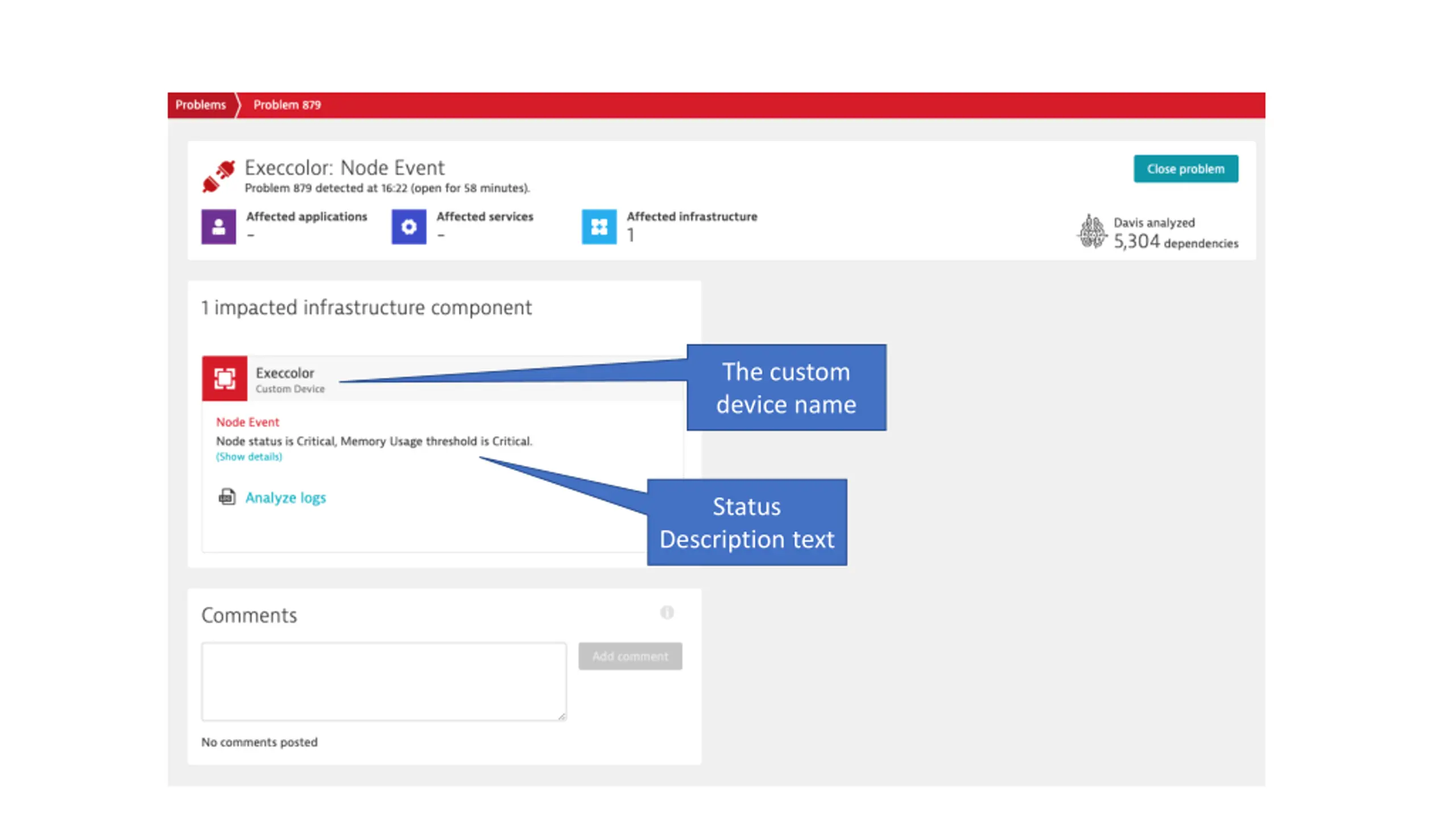 The custom device name Status Description text