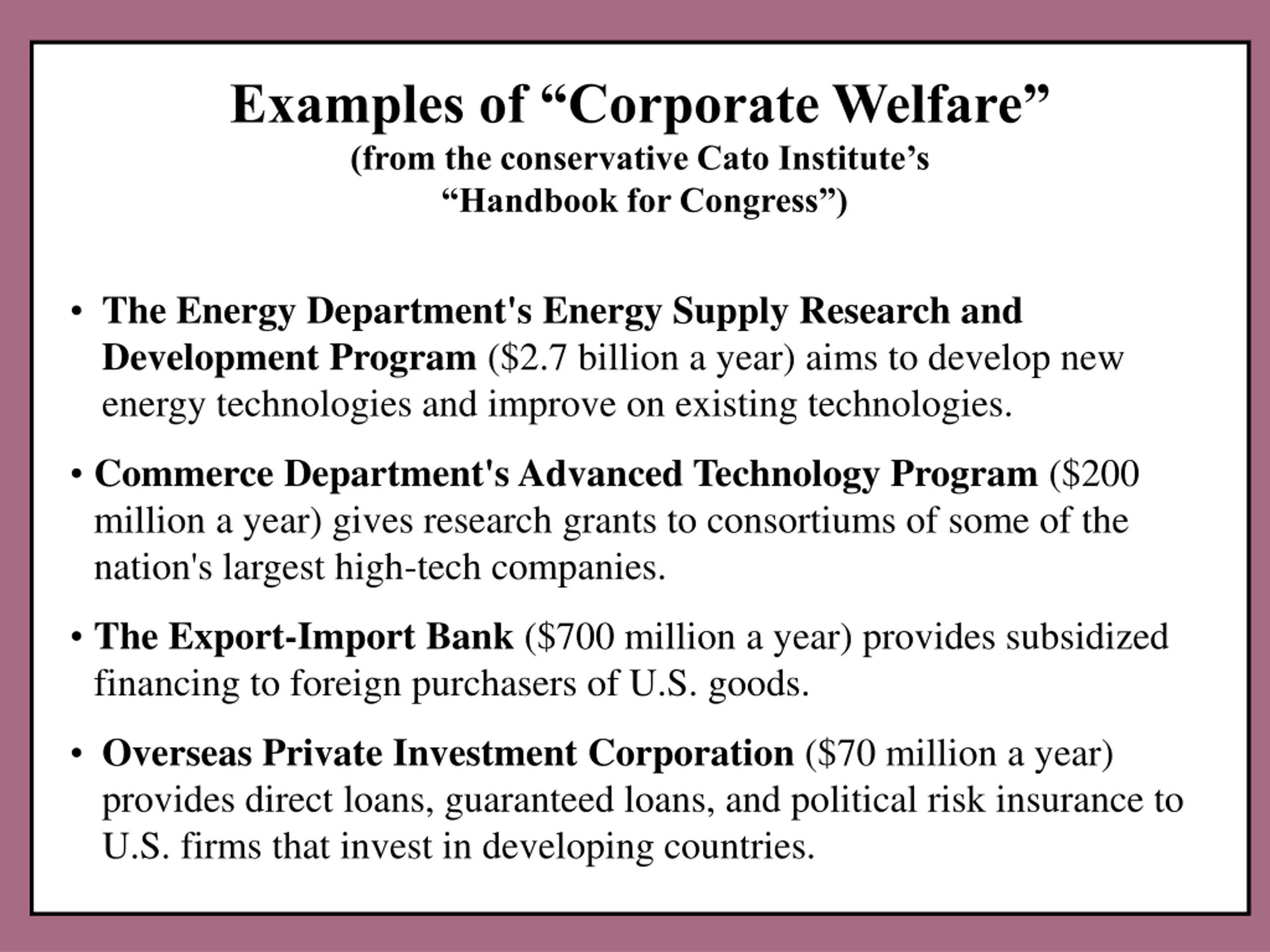 Examples of Corporate Welfare (from the conservative Cato Institute s Handbook for Congress ) The Energy Department's Energy Supply Research and Development Program ($2.7 billion a year) aims to develop new energy technologies and improve on existing technologies. Commerce Department's Advanced Technology Program ($200 million a year) gives research grants to consortiums of some of the nation's largest high-tech companies. The Export-Import Bank ($700 million a year) provides subsidized financing to foreign purchasers of U.S. goods. Overseas Private Investment Corporation ($70 million a year) provides direct loans, guaranteed loans, and political risk insurance to U.S. firms that invest in developing countries.