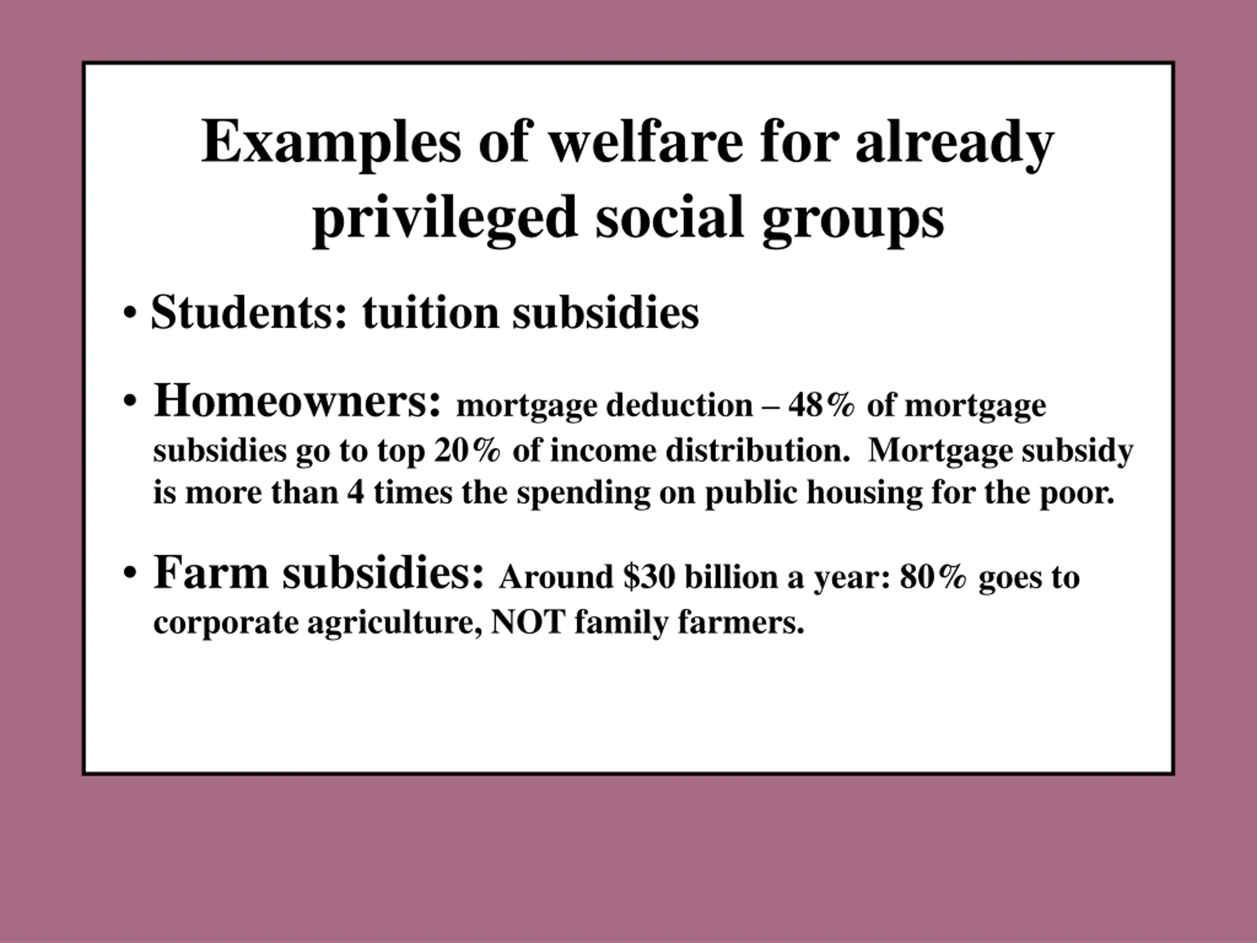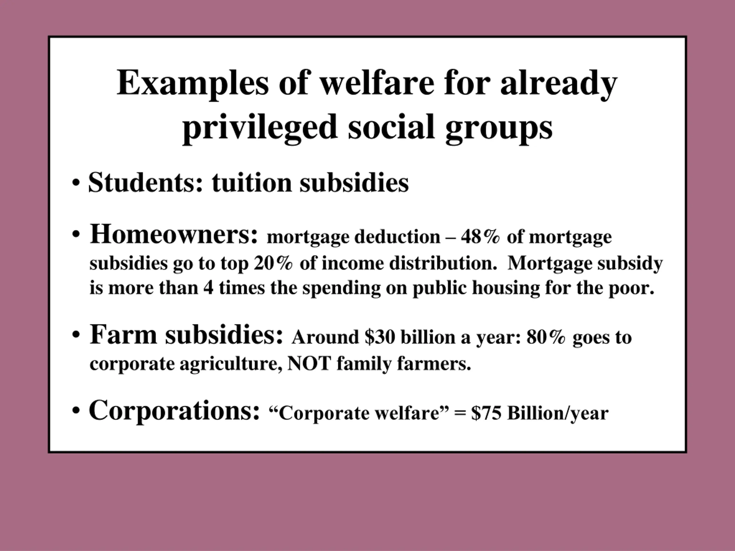 Examples of welfare for already privileged social groups Students: tuition subsidies Homeowners: mortgage deduction 48% of mortgage subsidies go to top 20% of income distribution. Mortgage subsidy is more than 4 times the spending on public housing for the poor. Farm subsidies: Around $30 billion a year: 80% goes to corporate agriculture, NOT family farmers. Corporations: Corporate welfare = $75 Billion/year