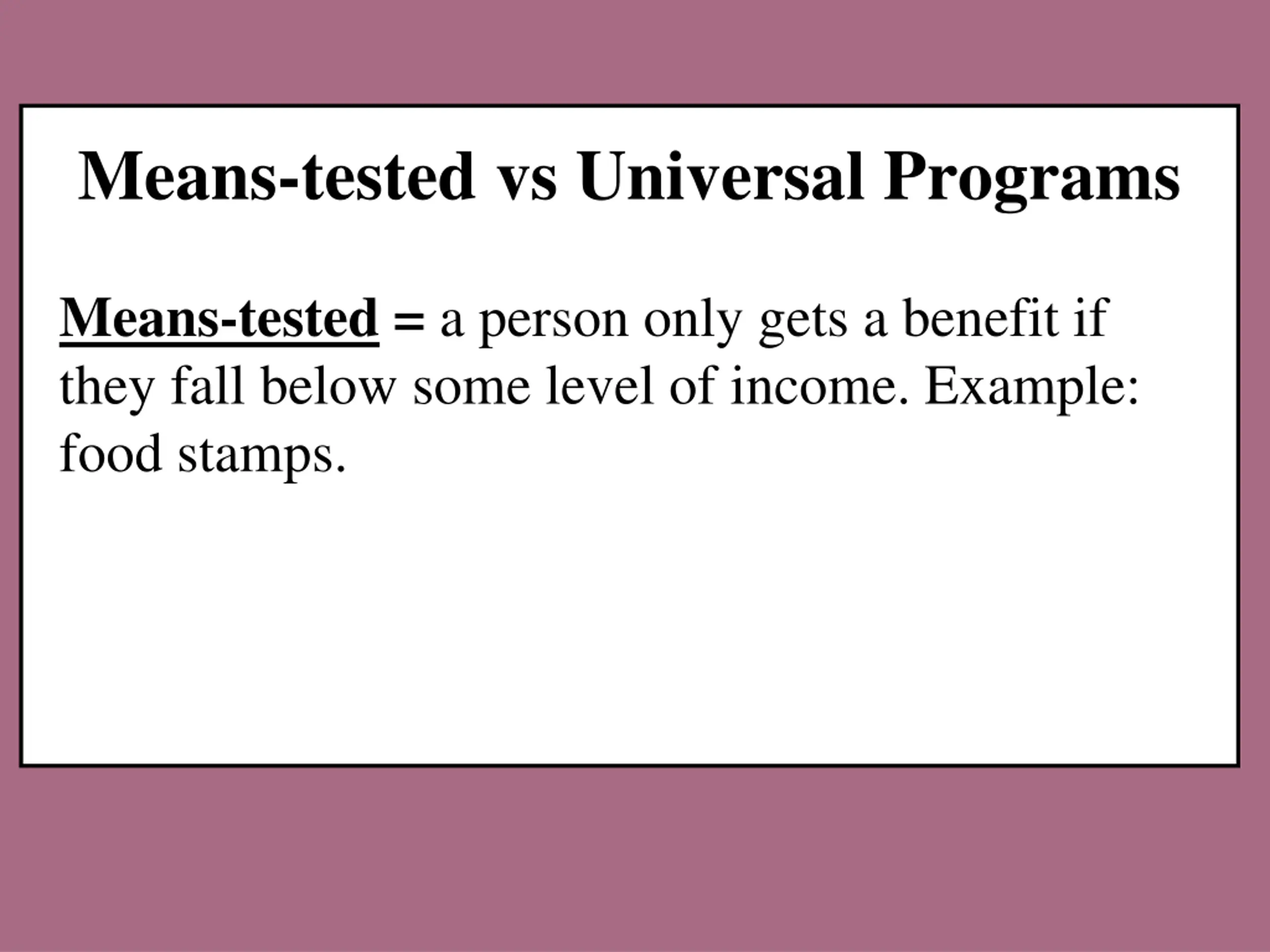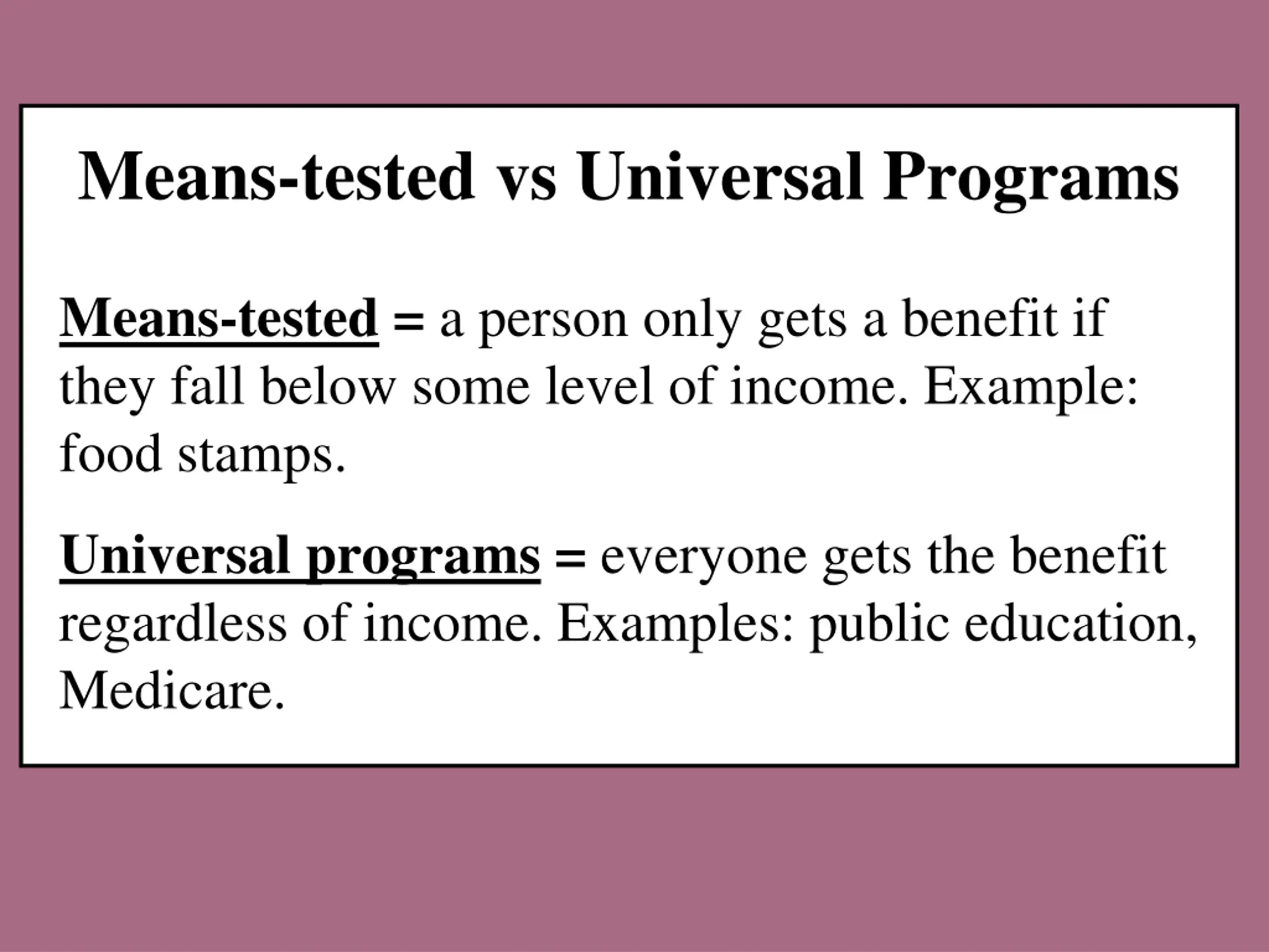 Means-tested vs Universal Programs Means-tested = a person only gets a benefit if they fall below some level of income. Example: food stamps. Universal programs = everyone gets the benefit regardless of income. Examples: public education, Medicare.