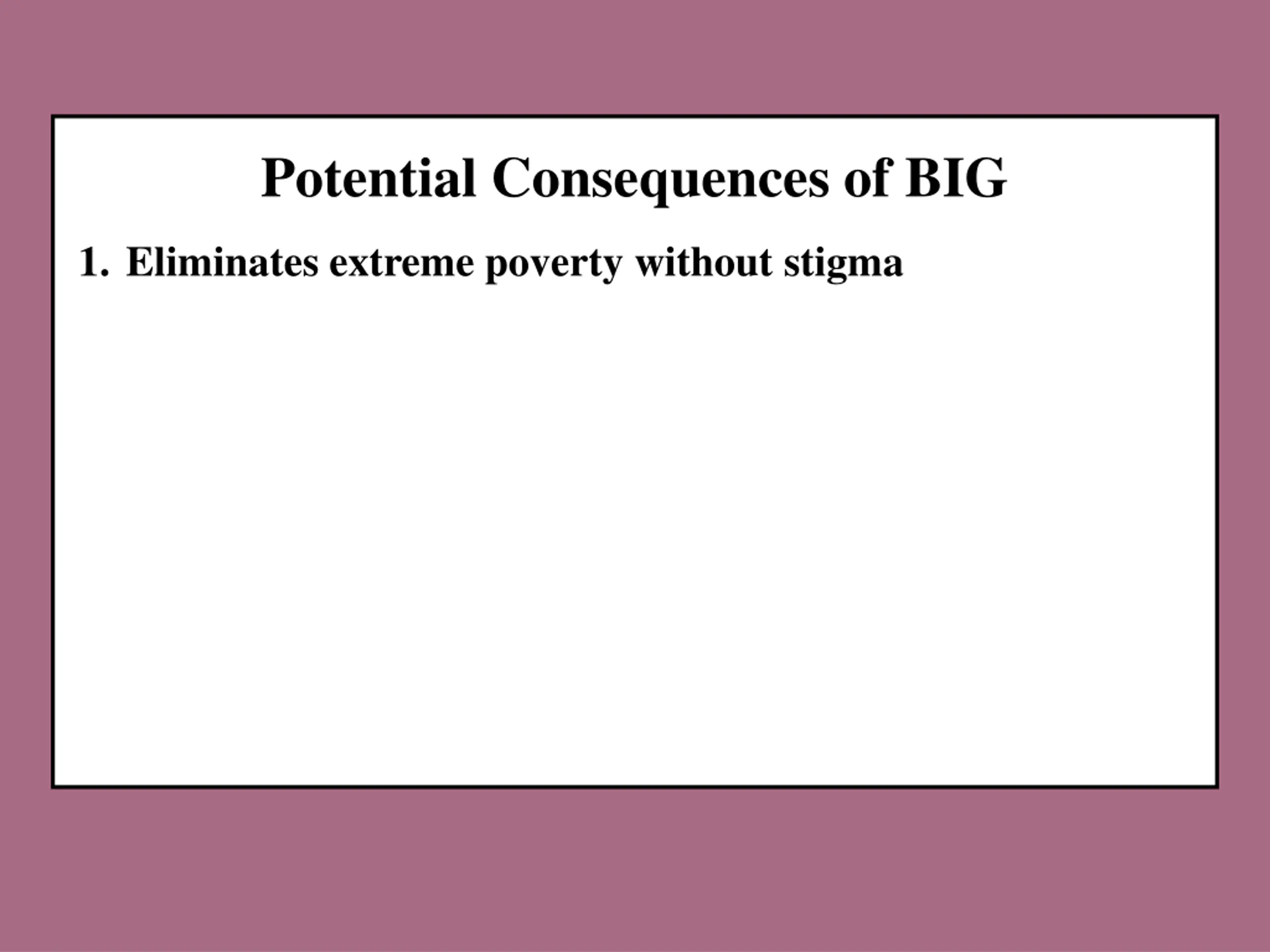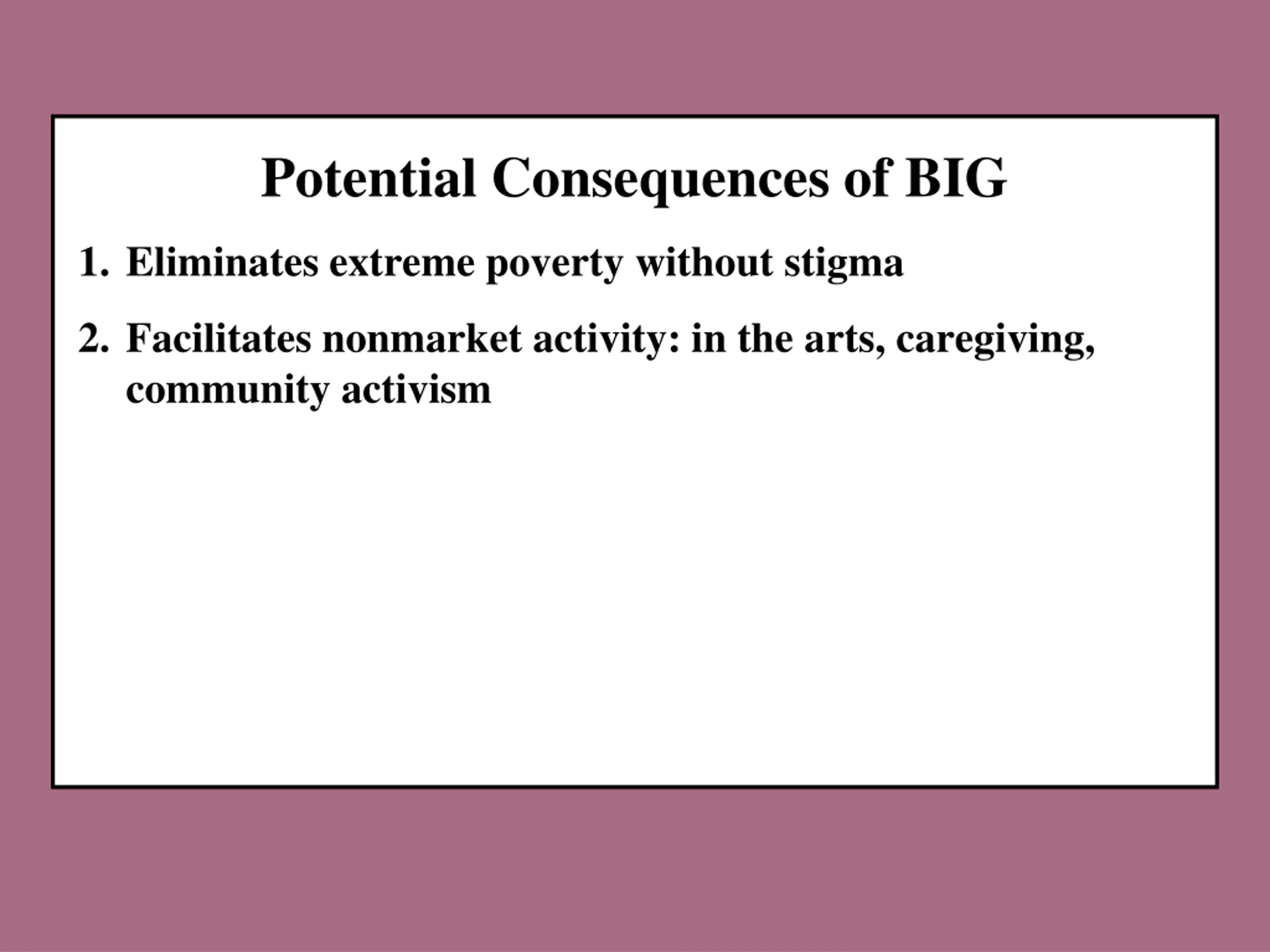 Potential Consequences of BIG 1. Eliminates extreme poverty without stigma 2. Facilitates nonmarket activity: in the arts, caregiving, community activism 3. Gives everyone a measure of real freedom (positive freedom) 4. Strengthens negative freedom: the freedom to say no 5. Puts pressure on employers to innovate to eliminate unpleasant, boring work because it is costly
