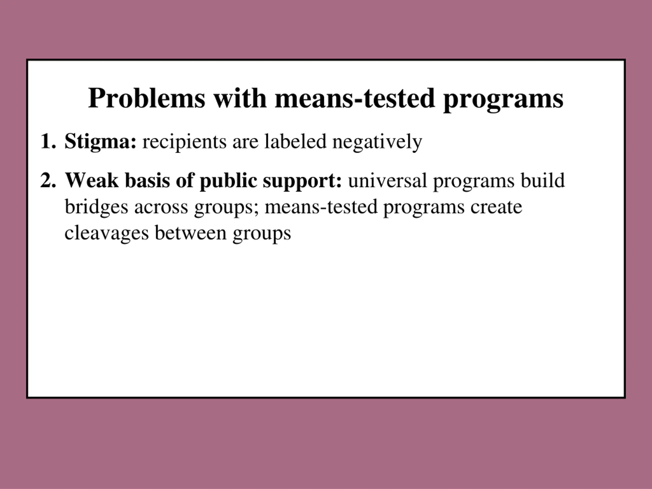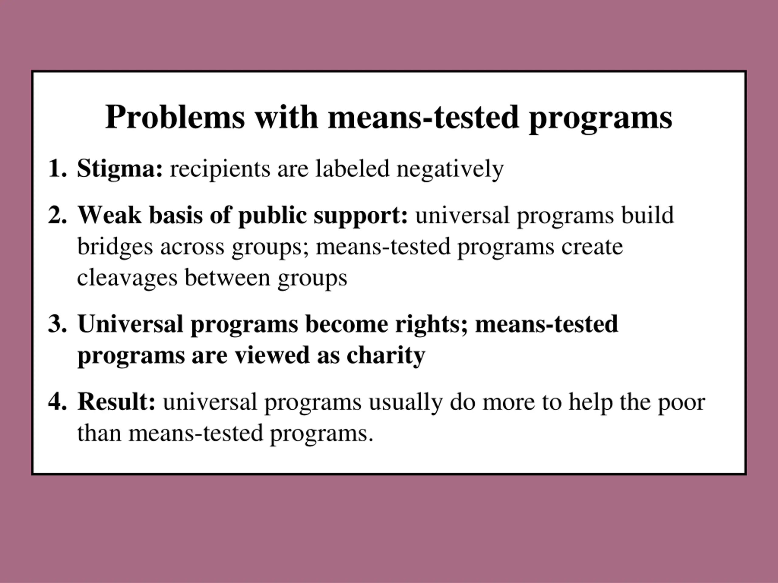 Problems with means-tested programs 1. Stigma: recipients are labeled negatively 2. Weak basis of public support: universal programs build bridges across groups; means-tested programs create cleavages between groups 3. Universal programs become rights; means-tested programs are viewed as charity 4. Result: universal programs usually do more to help the poor than means-tested programs.