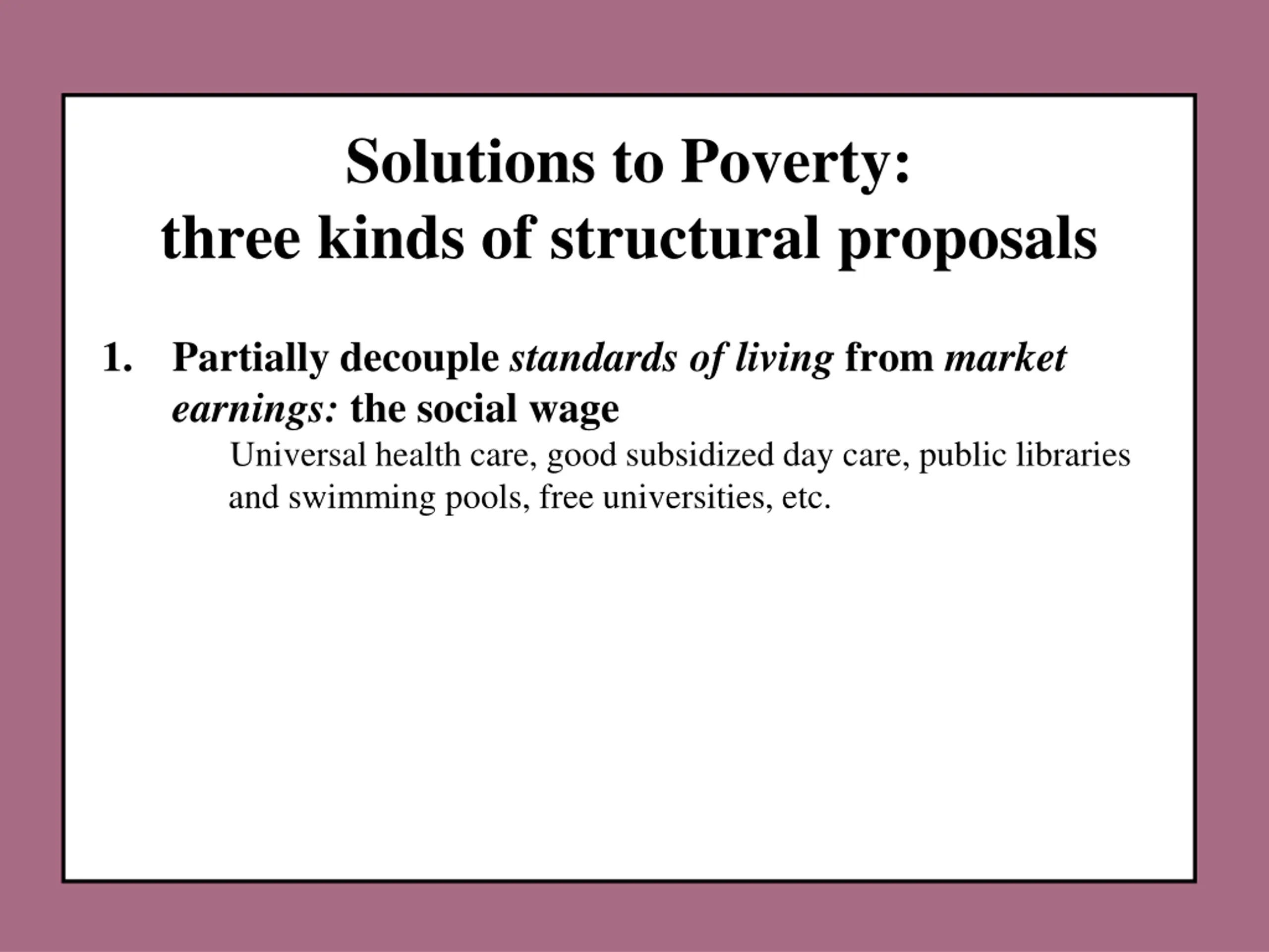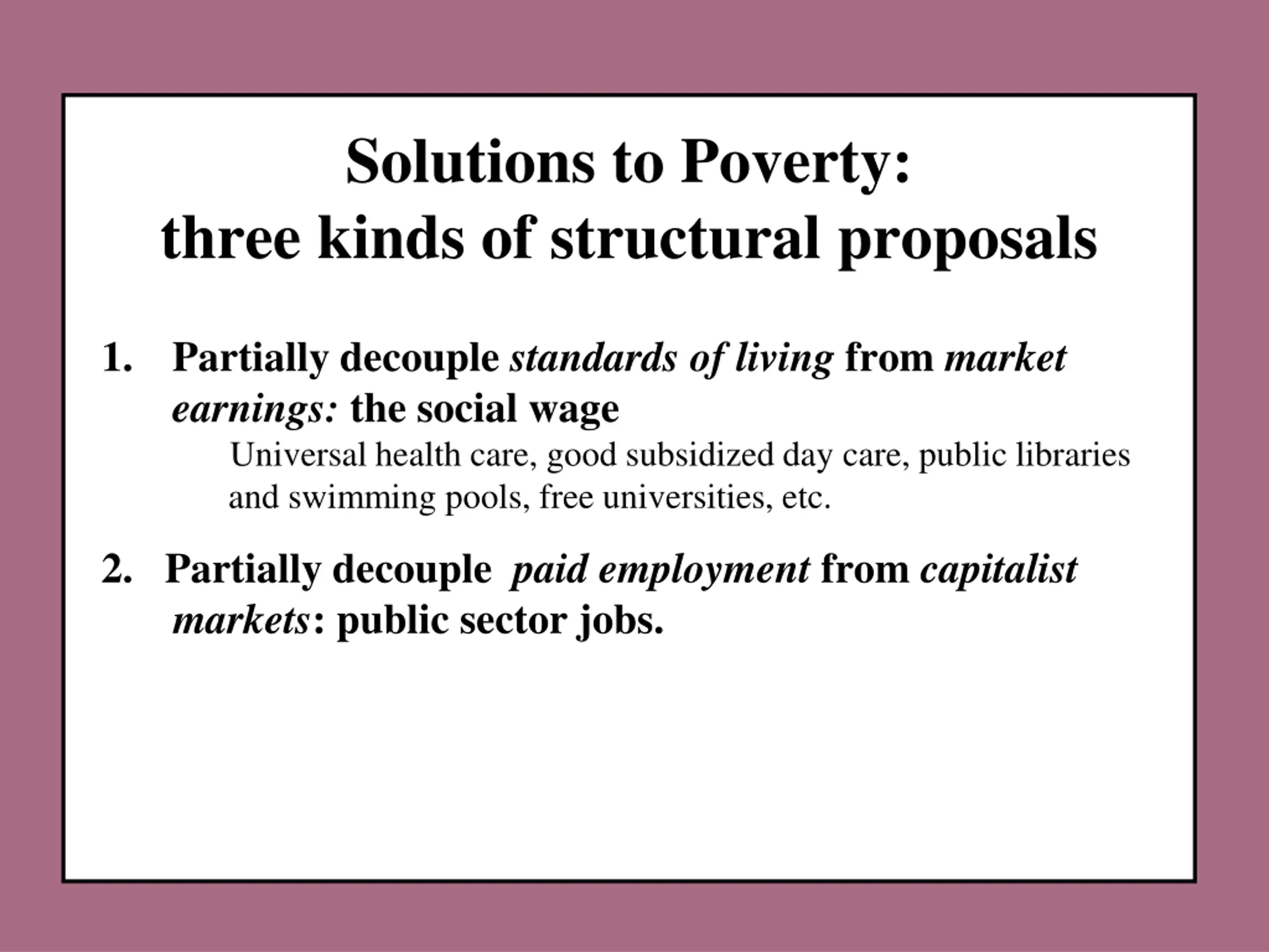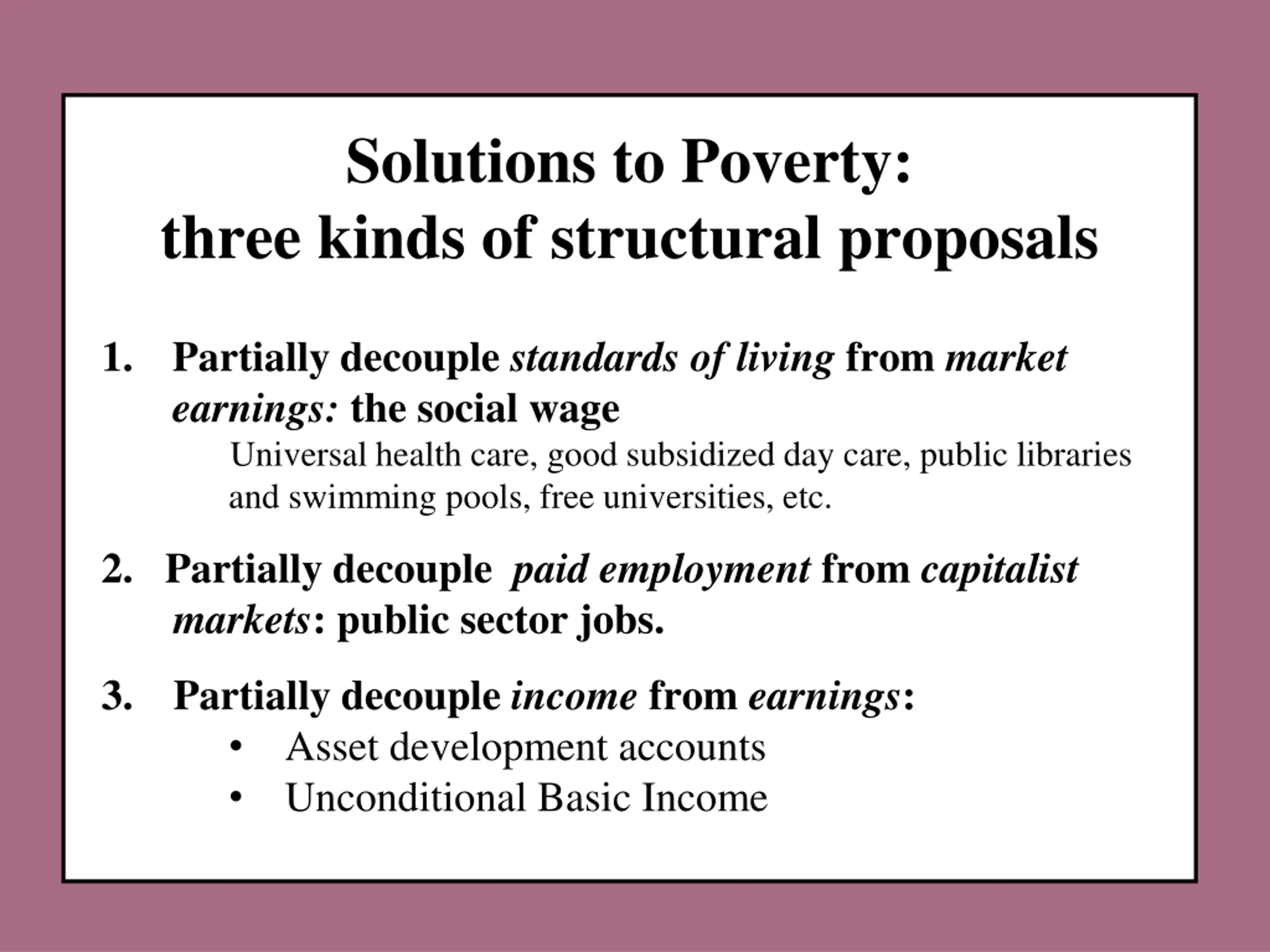 Solutions to Poverty: three kinds of structural proposals Partially decouple standards of living from market earnings: the social wage Universal health care, good subsidized day care, public libraries and swimming pools, free universities, etc. 1. 2. Partially decouple paid employment from capitalist markets: public sector jobs. 3. Partially decouple income from earnings: Asset development accounts Unconditional Basic Income