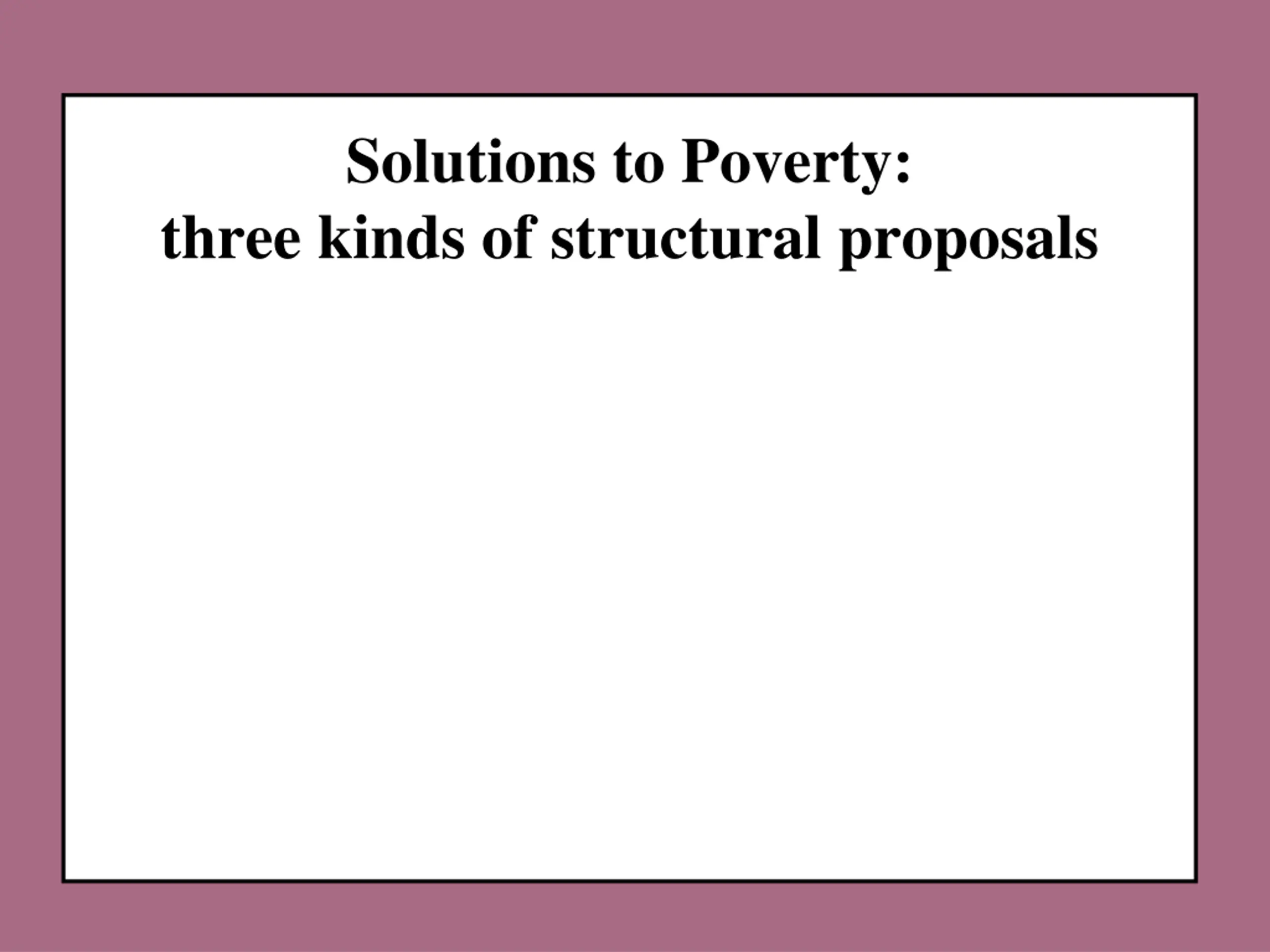 Solutions to Poverty: three kinds of structural proposals Partially decouple standards of living from market earnings: the social wage Universal health care, good public day care, public libraries and swimming pools, free universities, etc. 1. 2. Partially decouple paid employment from capitalist markets: public sector jobs. 3. Partially decouple income from earnings: Asset development accounts Basic Income Grants