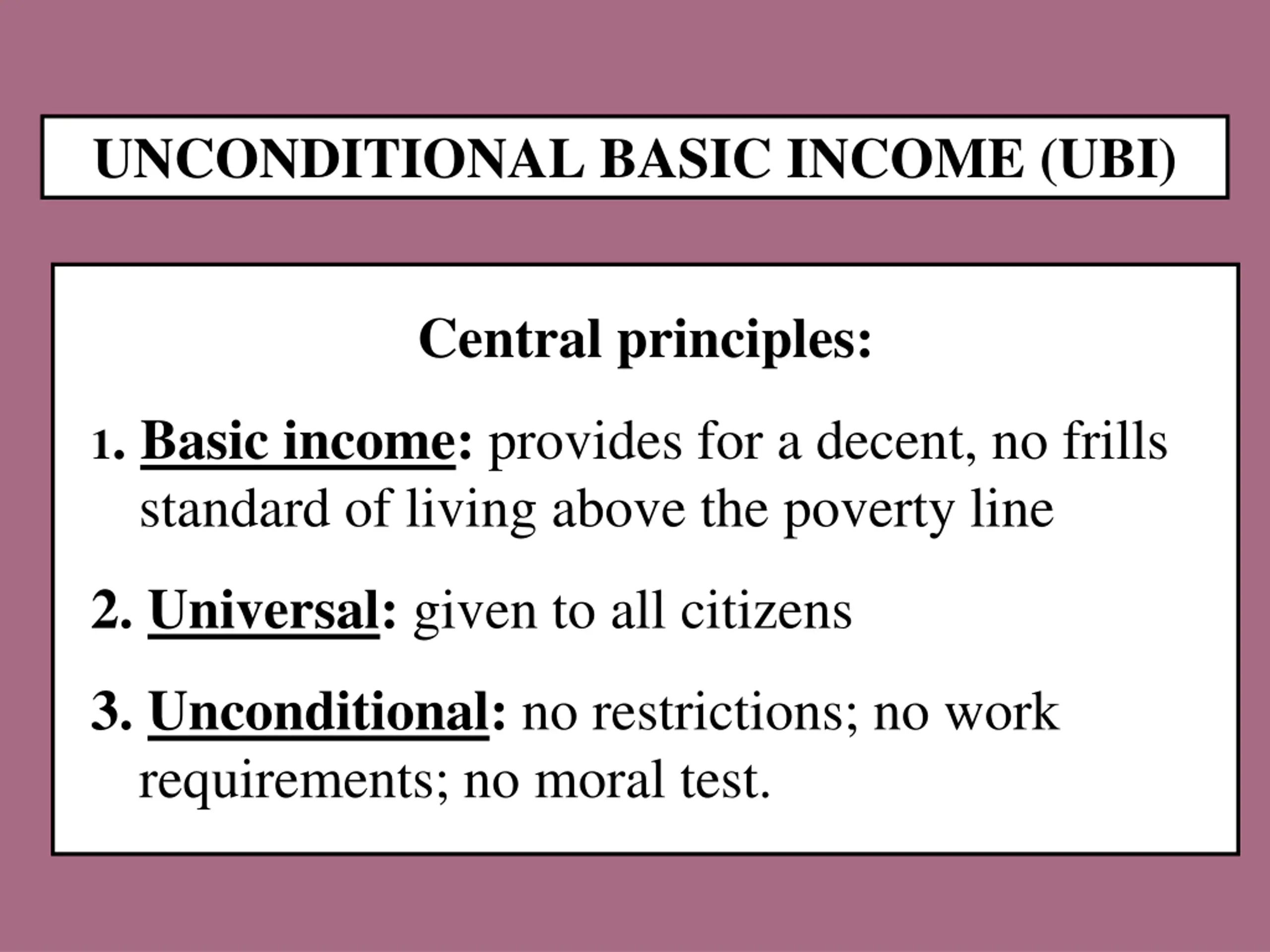 UNCONDITIONAL BASIC INCOME (UBI) Central principles: 1. Basic income: provides for a decent, no frills standard of living above the poverty line 2. Universal: given to all citizens 3. Unconditional: no restrictions; no work requirements; no moral test.