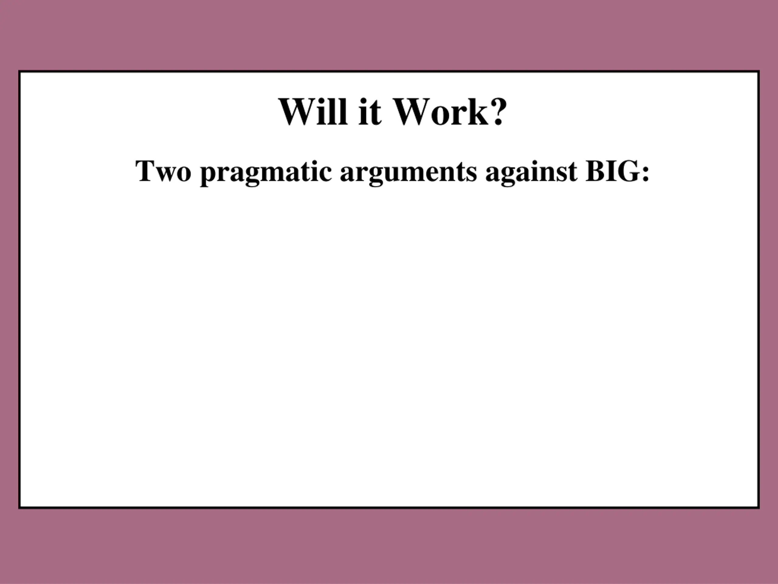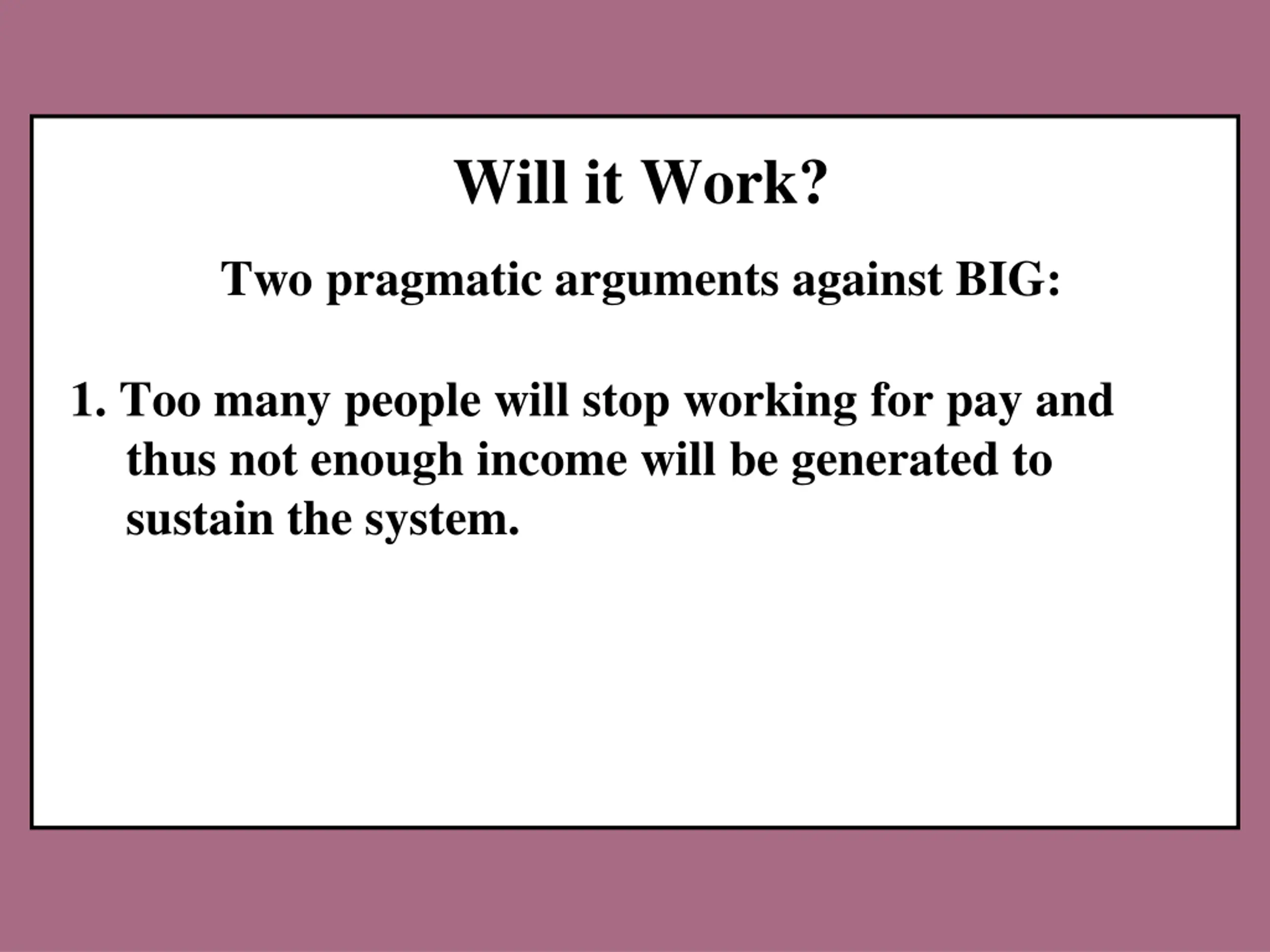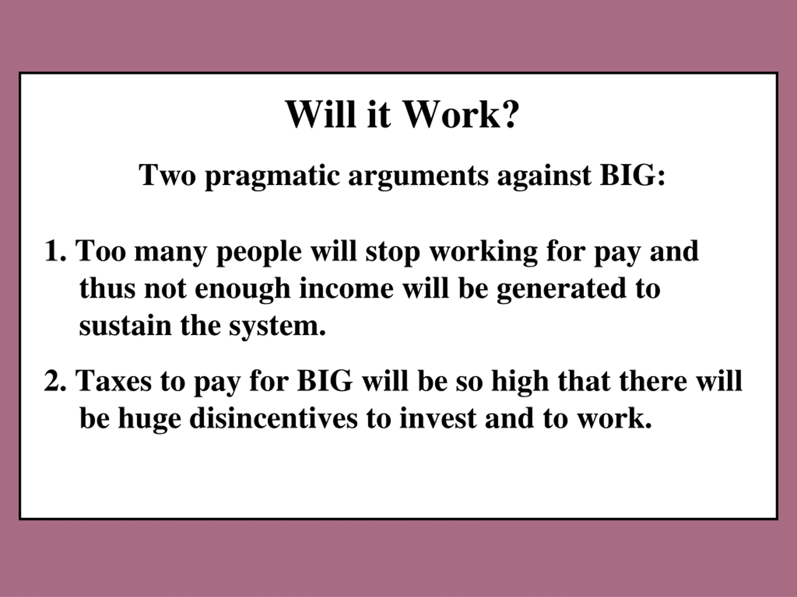 Will it Work? Two pragmatic arguments against BIG: 1. Too many people will stop working for pay and thus not enough income will be generated to sustain the system. 2. Taxes to pay for BIG will be so high that there will be huge disincentives to invest and to work.