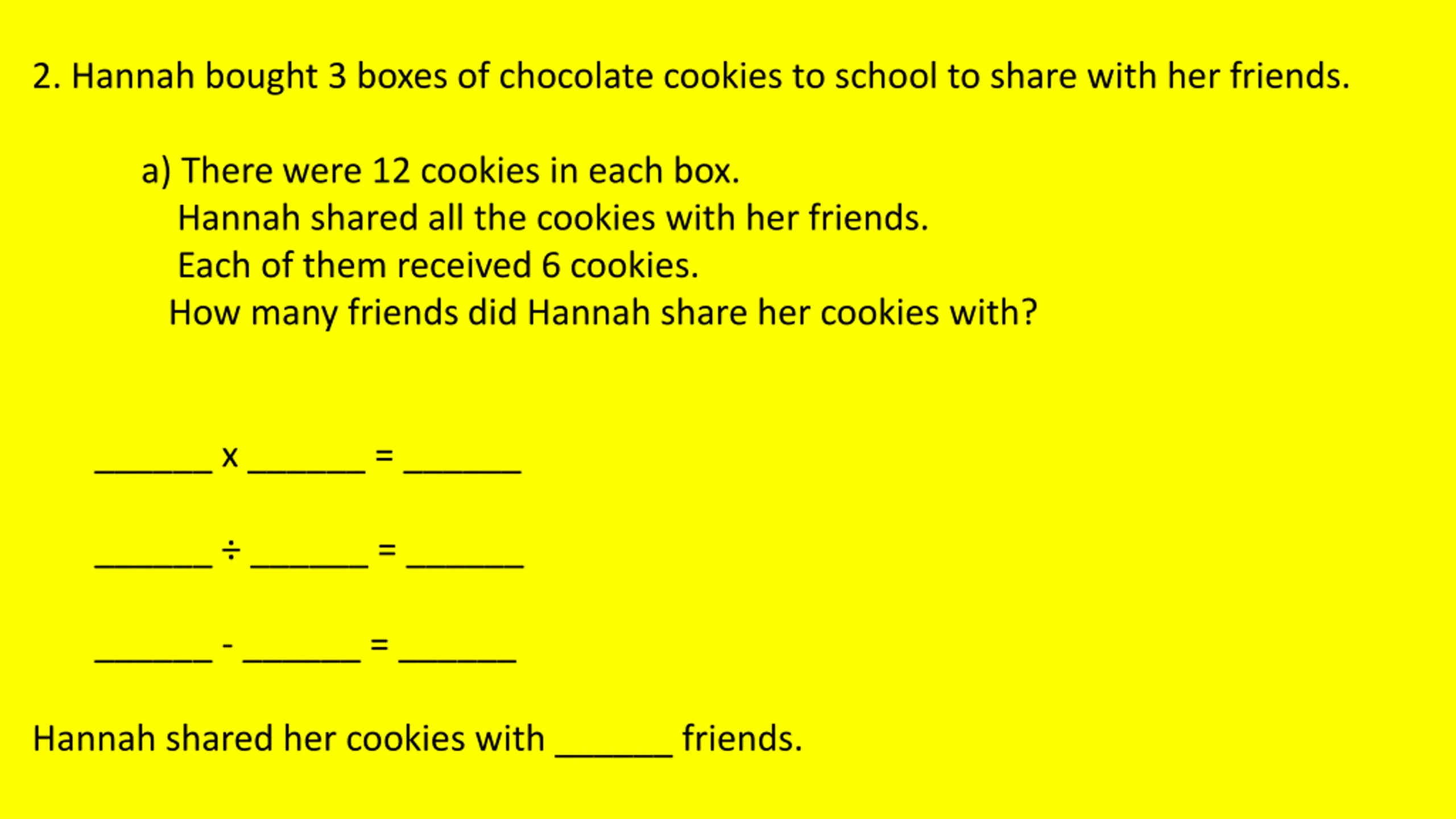 2. Hannah bought 3 boxes of chocolate cookies to school to share with her friends. a) There were 12 cookies in each box. Hannah shared all the cookies with her friends. Each of them received 6 cookies. How many friends did Hannah share her cookies with? ______ x ______ = ______ ______ ______ = ______ ______ - ______ = ______ Hannah shared her cookies with ______ friends.