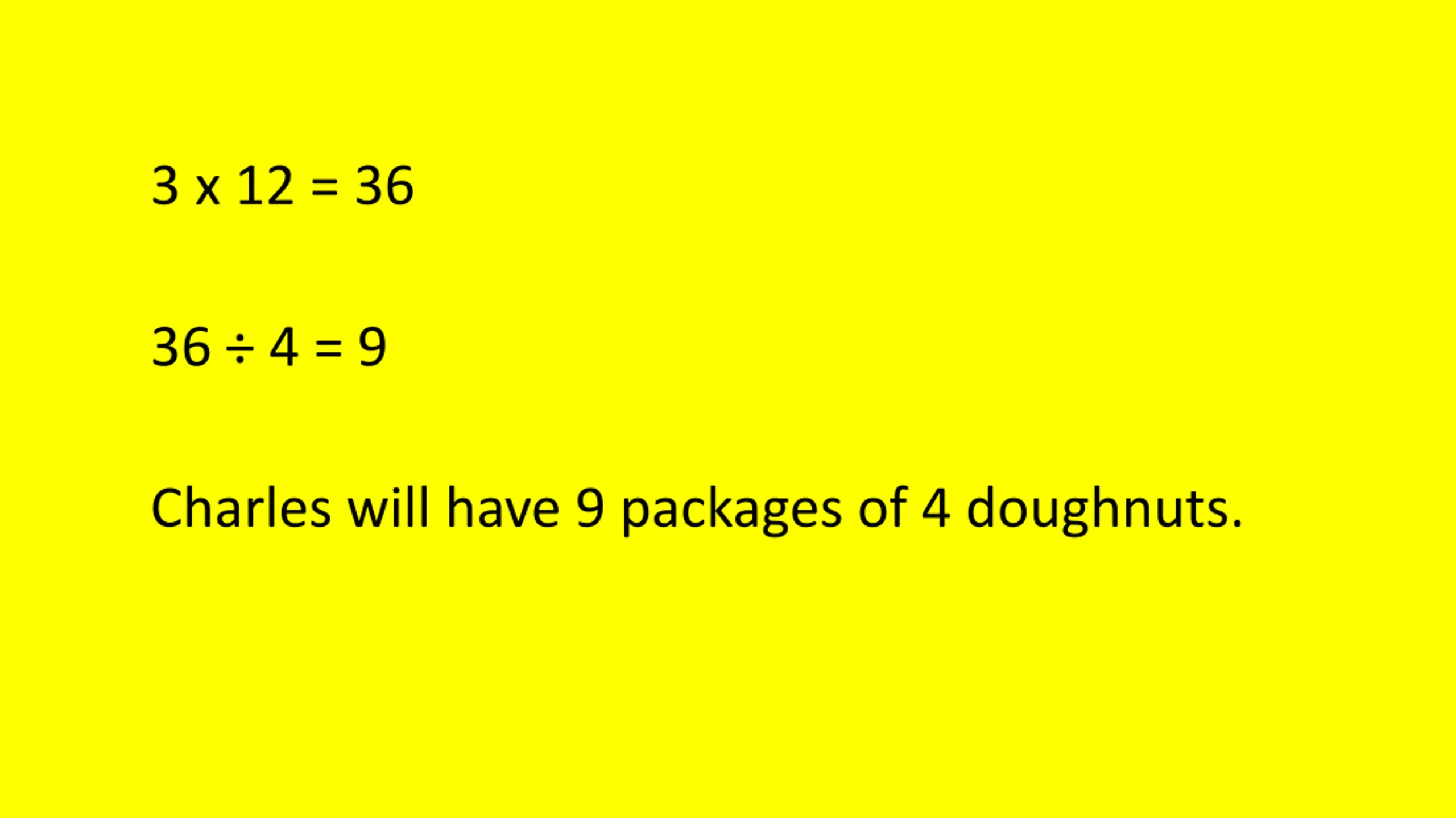 3 x 12 = 36 36 4 = 9 Charles will have 9 packages of 4 doughnuts.
