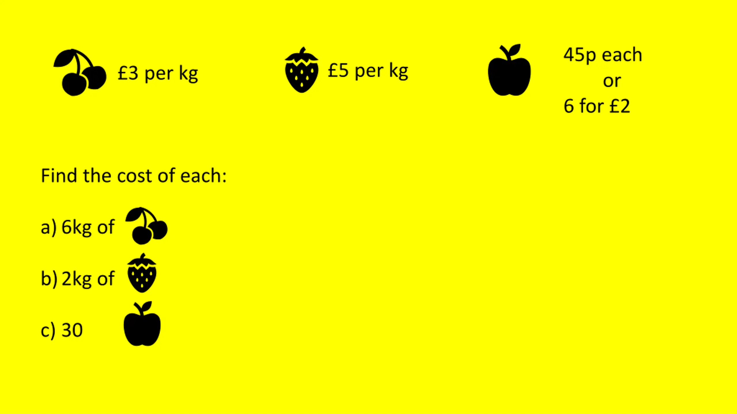 45p each or 6 for 2 5 per kg 3 per kg Find the cost of each: a)6kg of b)2kg of c) 30