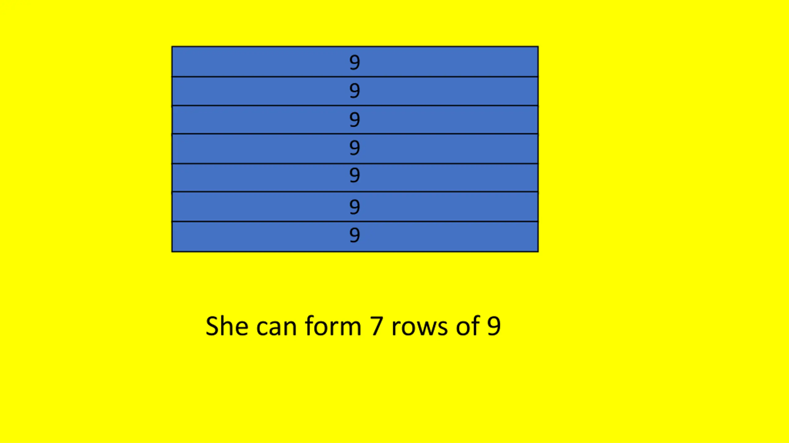 9 9 9 9 9 9 9 She can form 7 rows of 9