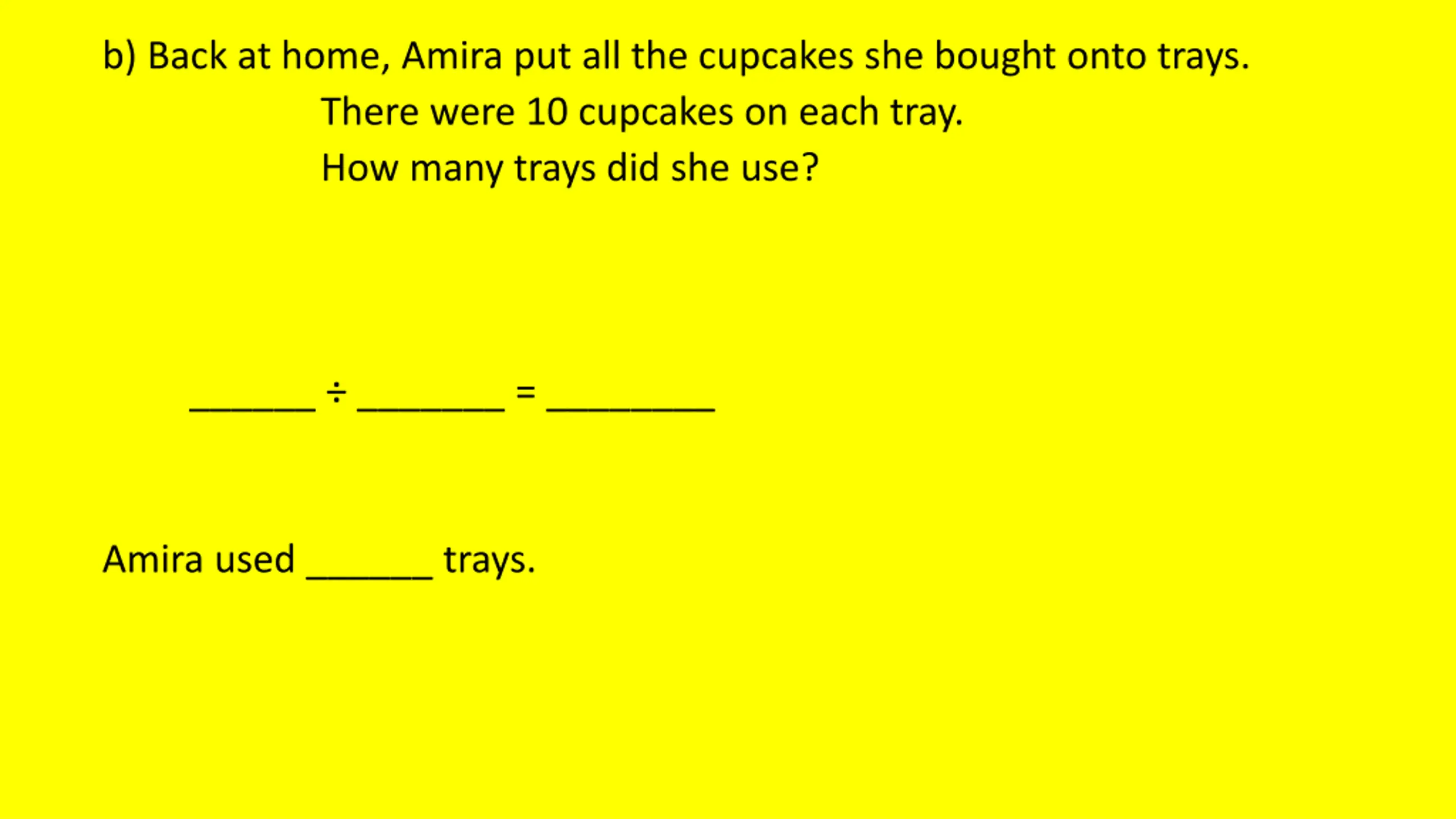 b) Back at home, Amira put all the cupcakes she bought onto trays. There were 10 cupcakes on each tray. How many trays did she use? ______ _______ = ________ Amira used ______ trays.