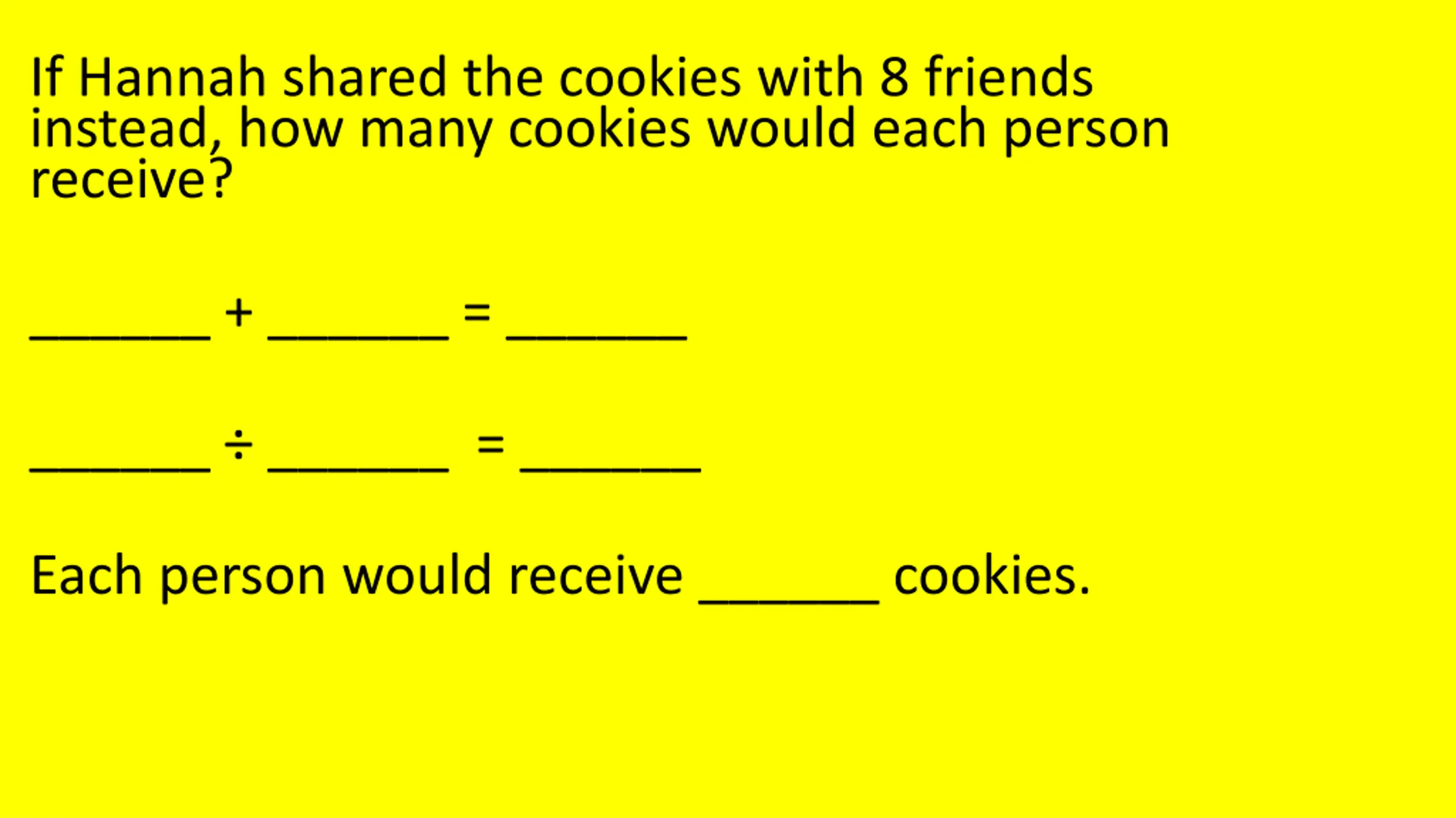 If Hannah shared the cookies with 8 friends instead, how many cookies would each person receive? ______ + ______ = ______ ______ ______ = ______ Each person would receive ______ cookies.