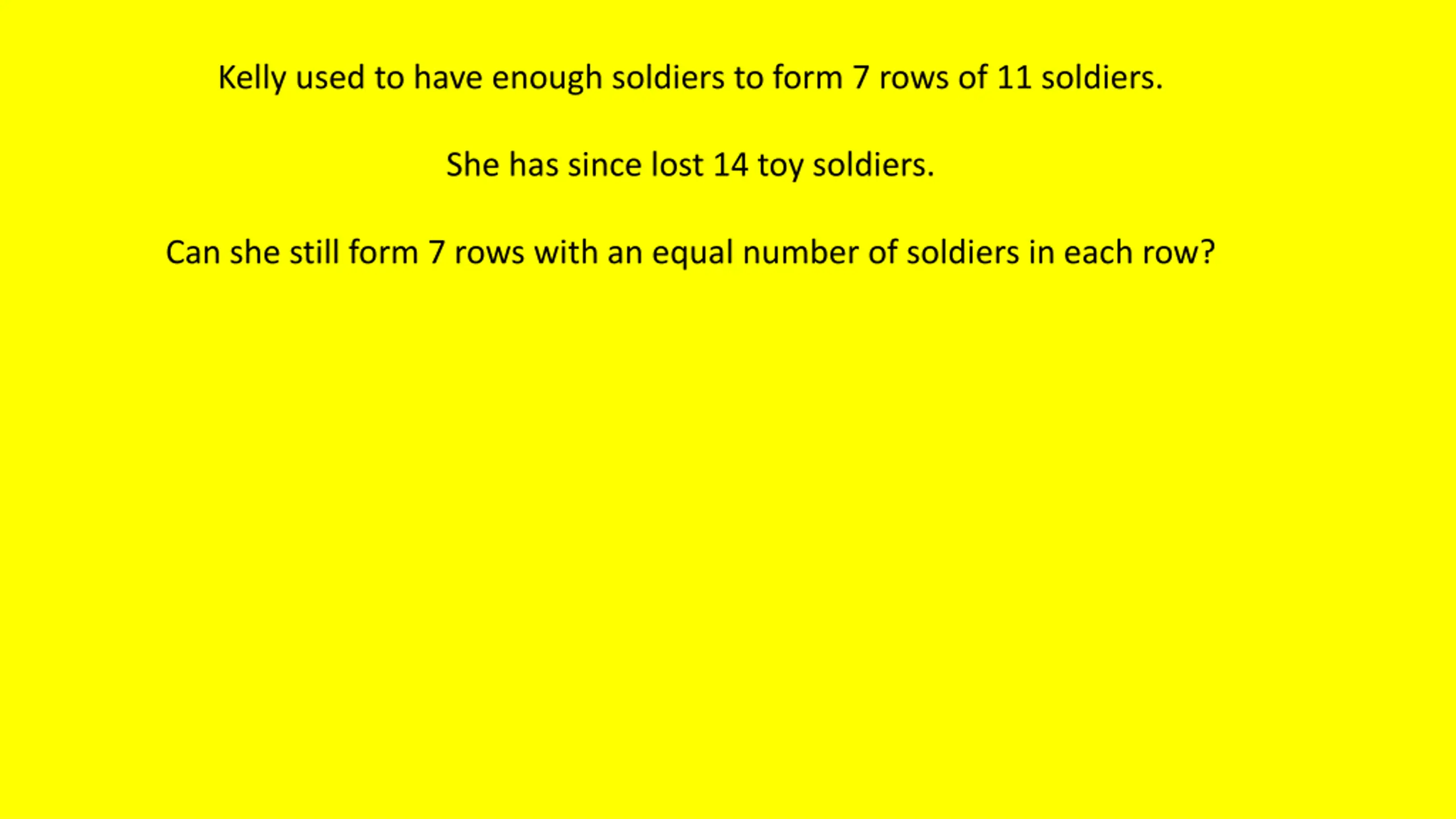 Kelly used to have enough soldiers to form 7 rows of 11 soldiers. She has since lost 14 toy soldiers. Can she still form 7 rows with an equal number of soldiers in each row?