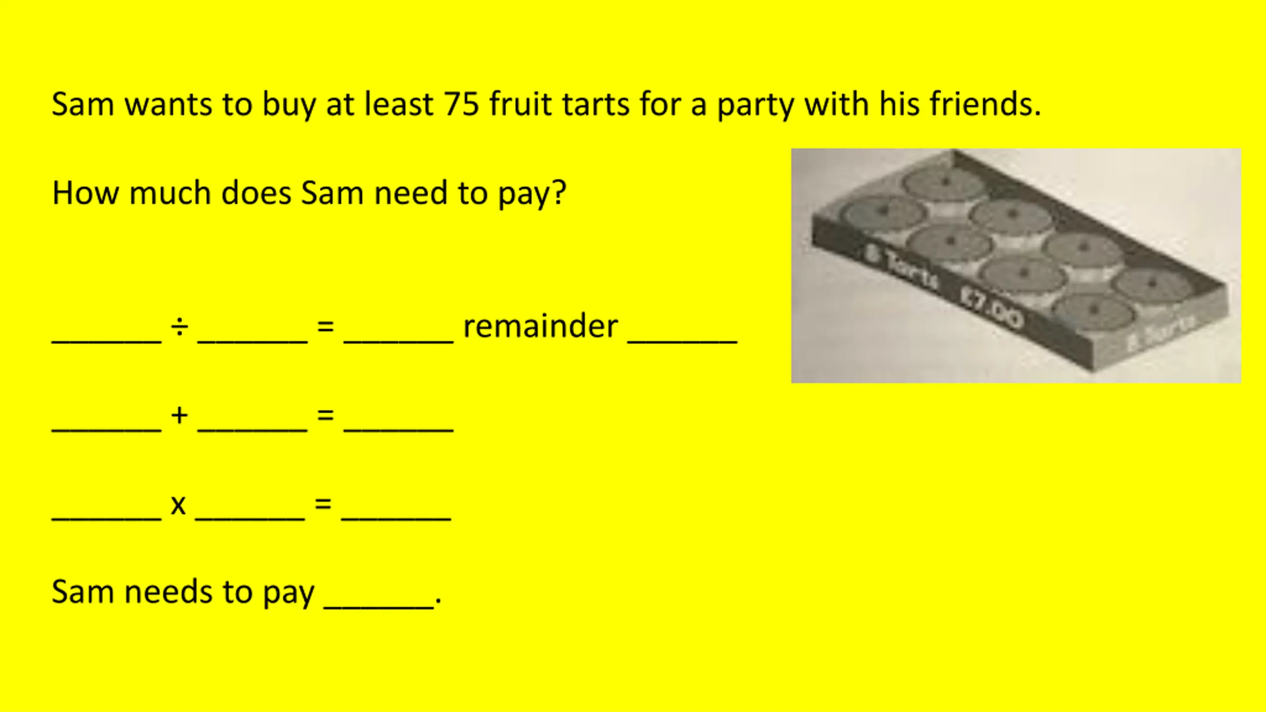 Sam wants to buy at least 75 fruit tarts for a party with his friends. How much does Sam need to pay? ______ ______ = ______ remainder ______ ______ + ______ = ______ ______ x ______ = ______ Sam needs to pay ______.