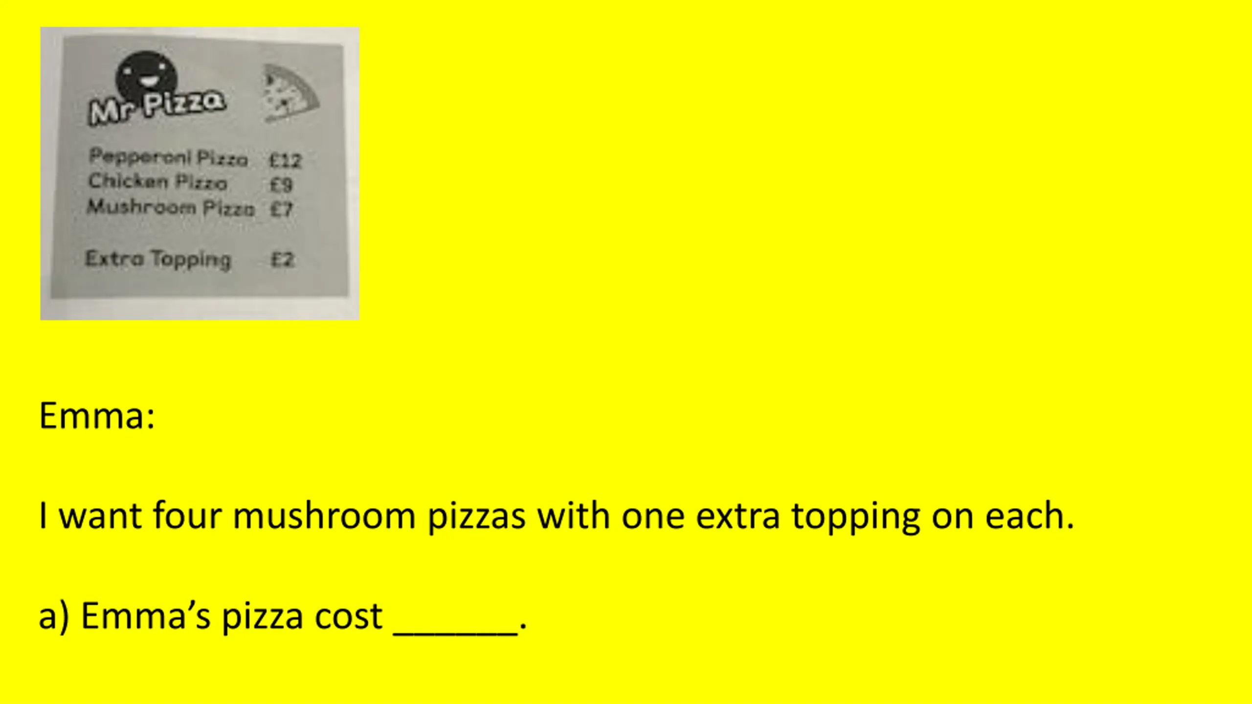 Emma: I want four mushroom pizzas with one extra topping on each. a) Emma s pizza cost ______.