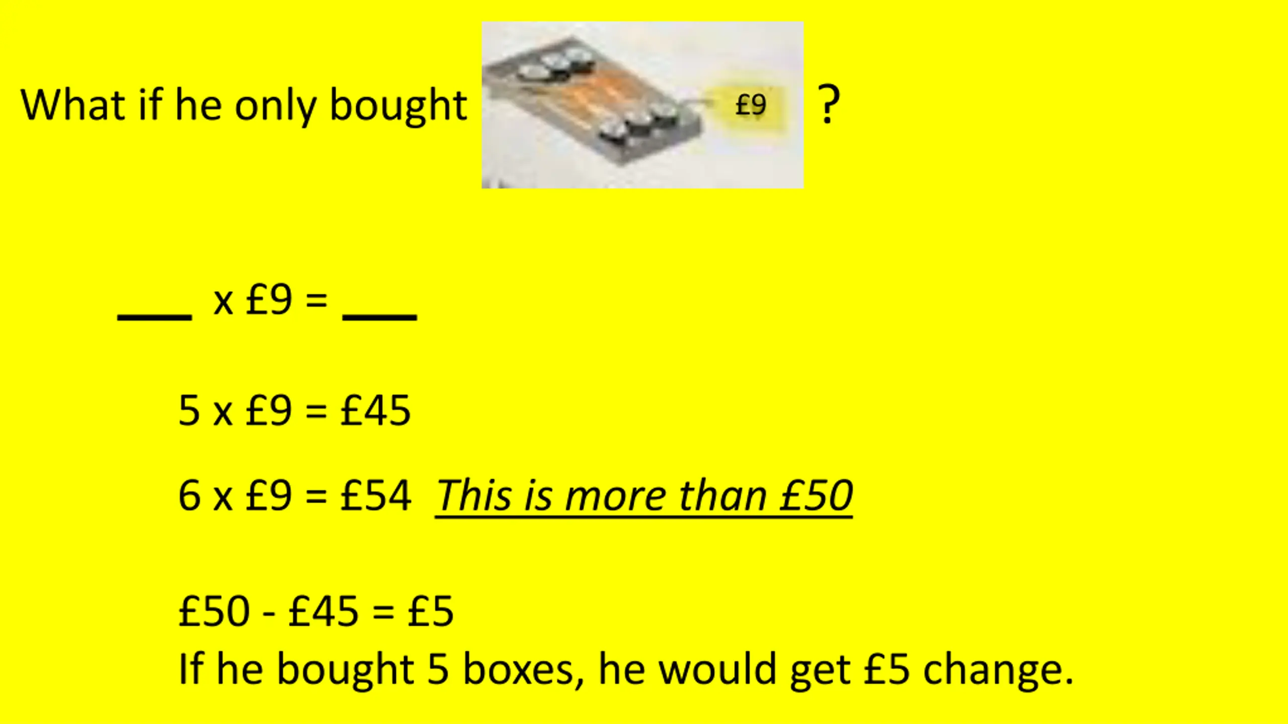 ? What if he only bought 9 x 9 = 5 x 9 = 45 6 x 9 = 54 This is more than 50 50 - 45 = 5 If he bought 5 boxes, he would get 5 change.